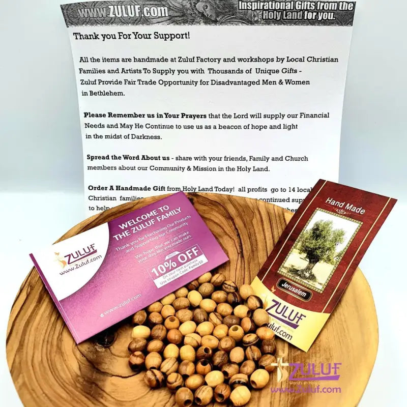 Each bead is a small piece of the Holy Land, made with love and care by local Christian families. Your purchase directly helps preserve the tradition and supports livelihoods in Bethlehem.