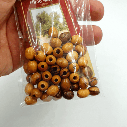 These oval olive wood beads are made by hand in the Holy Land using natural olive branches gathered through seasonal pruning . Each bead is gently shaped and polished one by one, bringing out the soft grain and warm, earthy tones that olive wood is known for .