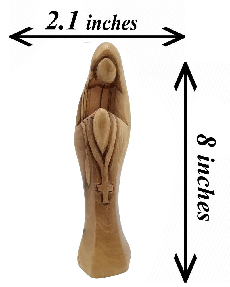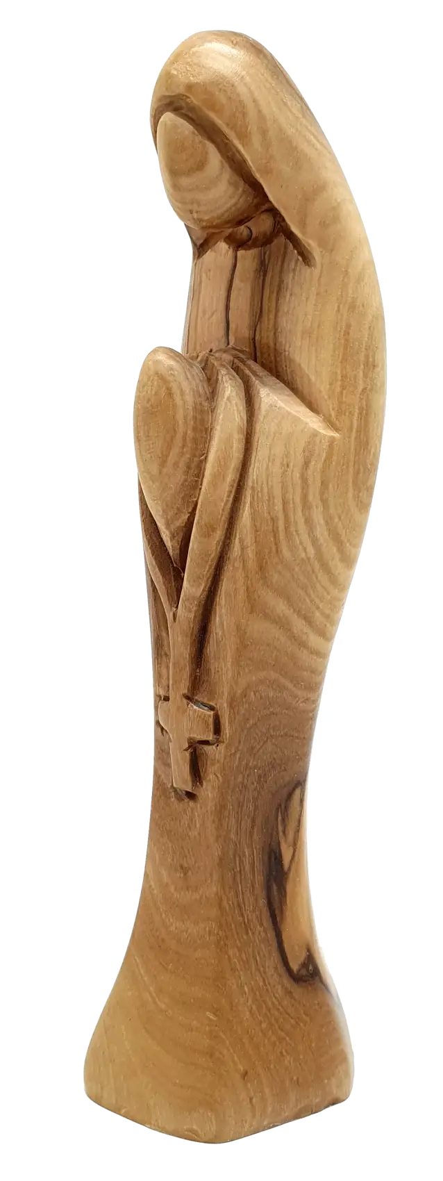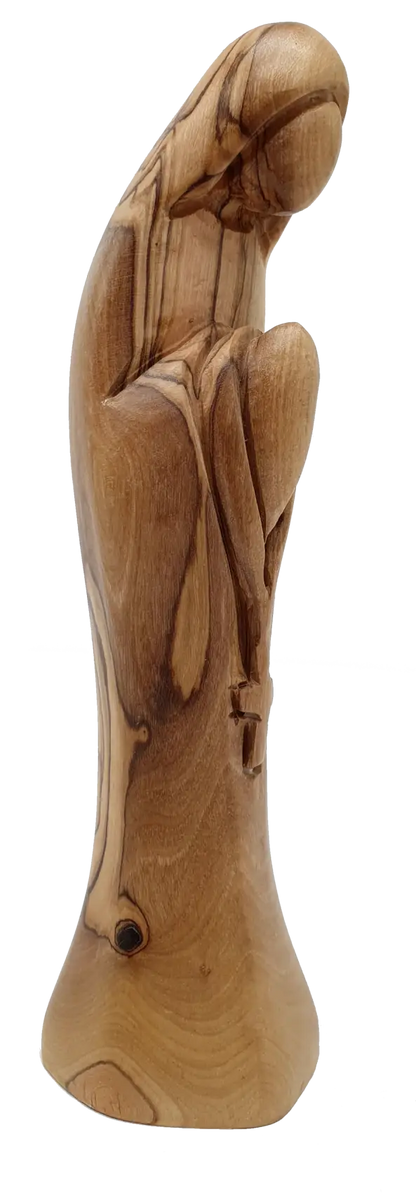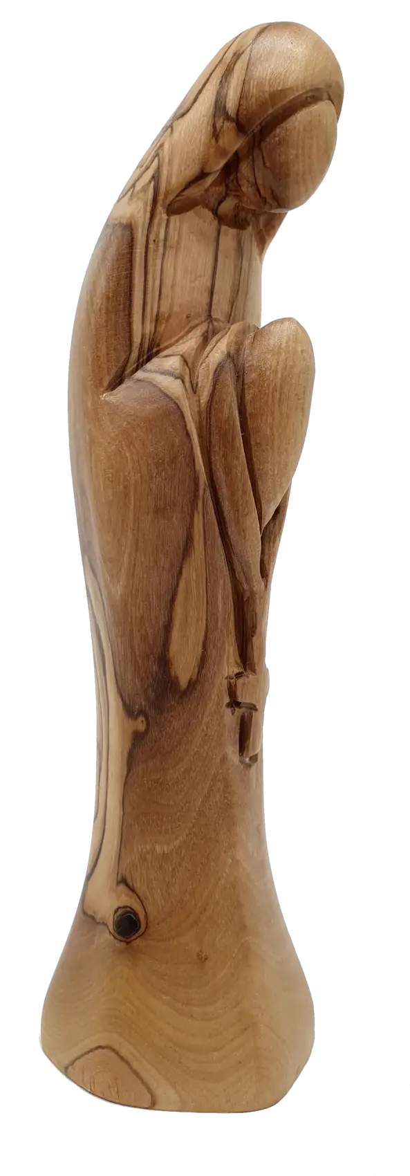 This statue of the Holy Virgin Mary in prayer is carefully hand made from real olive wood, taken from the hills of the Holy Land. Every piece is shaped by skilled Christian artisans who practiced this craft for generations. The size around 8x12x3 inches and make it a beautiful focal point for a prayer corner, or a quiet, graceful presence on any shelf or mantle. Its simple statue, honest and full of meaning.