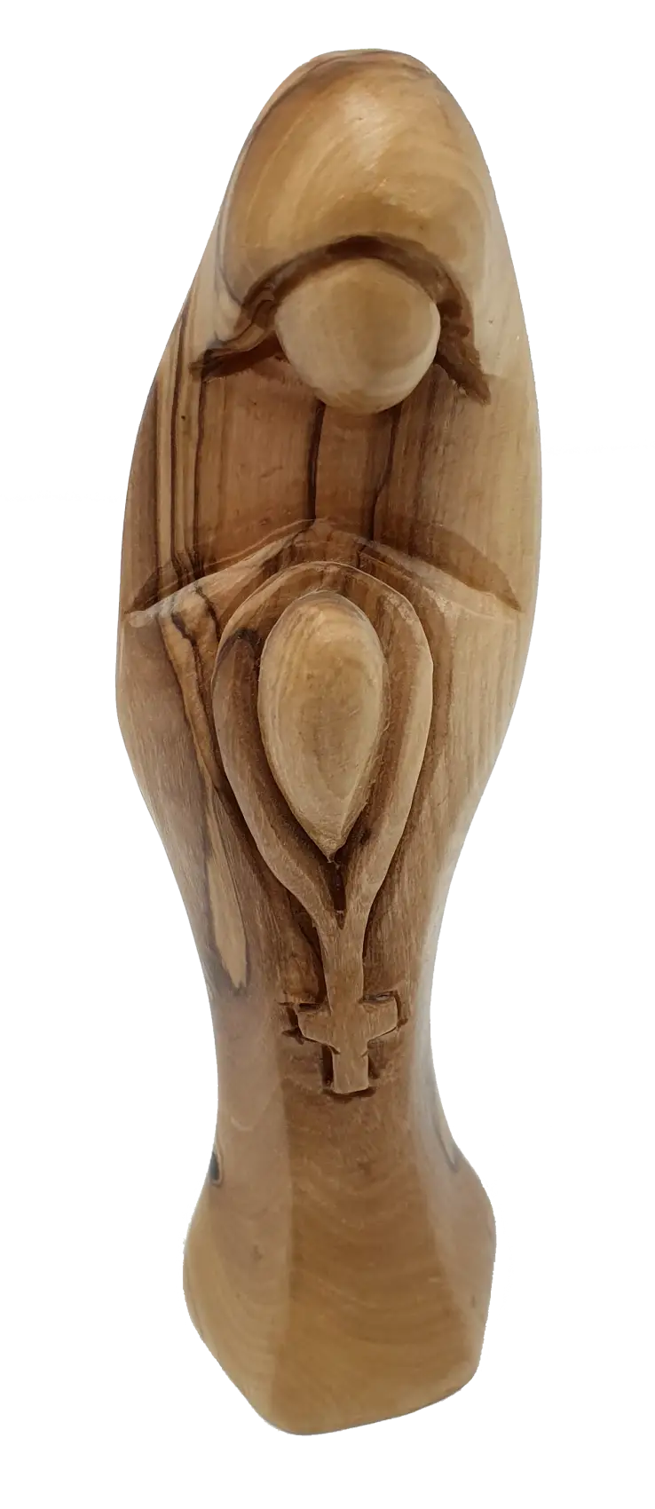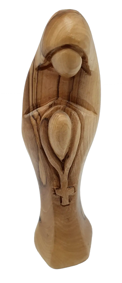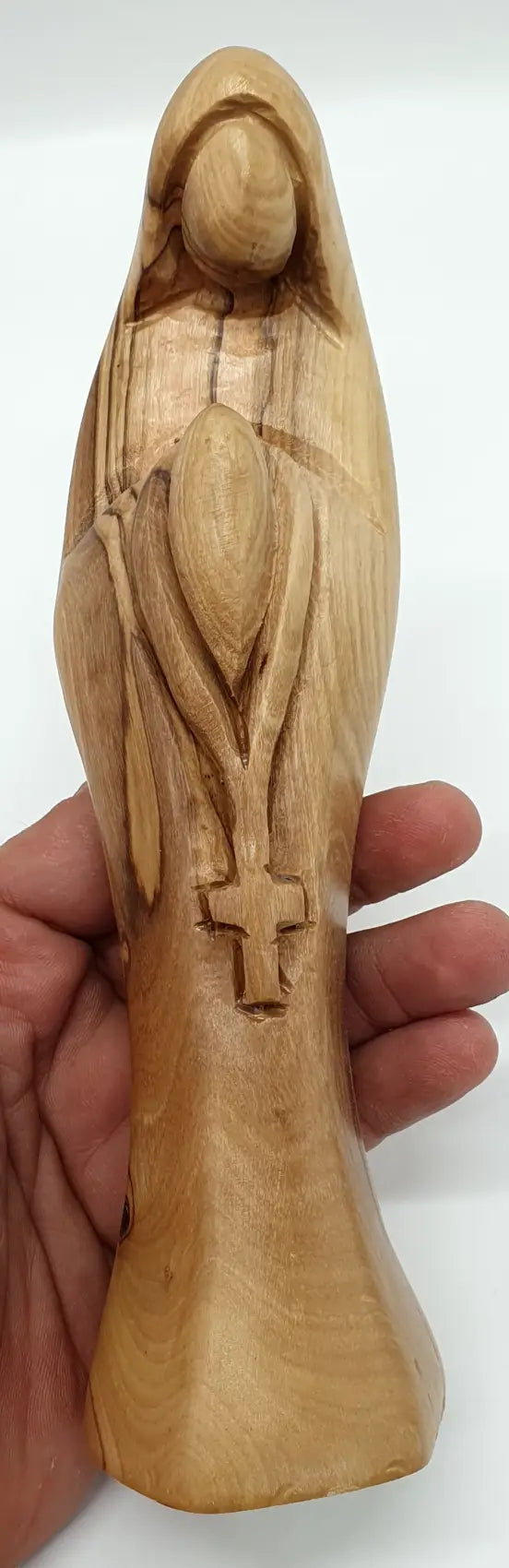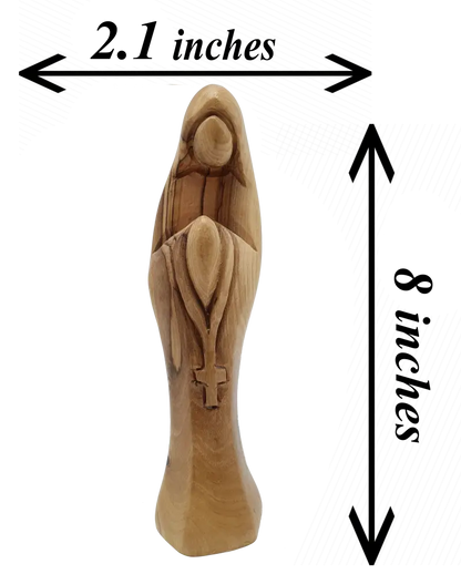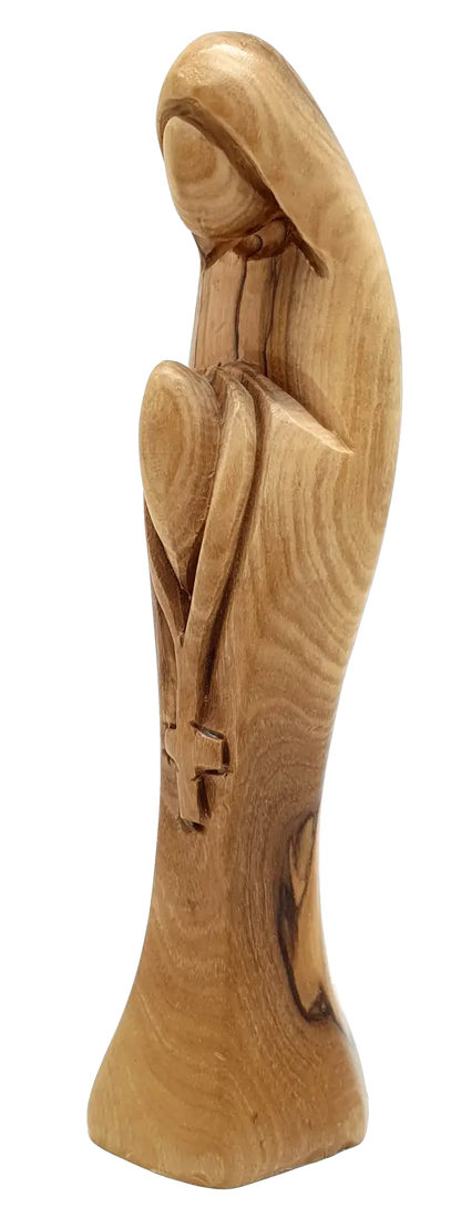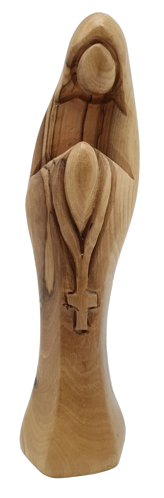 This statue of the Holy Virgin Mary in prayer is carefully hand made from real olive wood, taken from the hills of the Holy Land. Every piece is shaped by skilled Christian artisans who practiced this craft for generations. The size around 8x12x3 inches and make it a beautiful focal point for a prayer corner, or a quiet, graceful presence on any shelf or mantle. Its simple statue, honest and full of meaning.