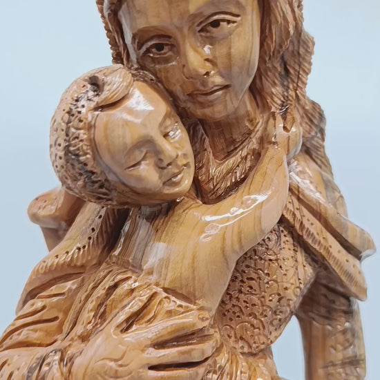 Every detail tells a story from the gentle expression on Mary’s face to the tender embrace of the Child Jesus resting securely in her arms . The flowing garments, textured folds, and carefully sculpted features highlight the natural beauty of olive wood, with warm tones and unique grain patterns that ensure no two pieces are ever alike .