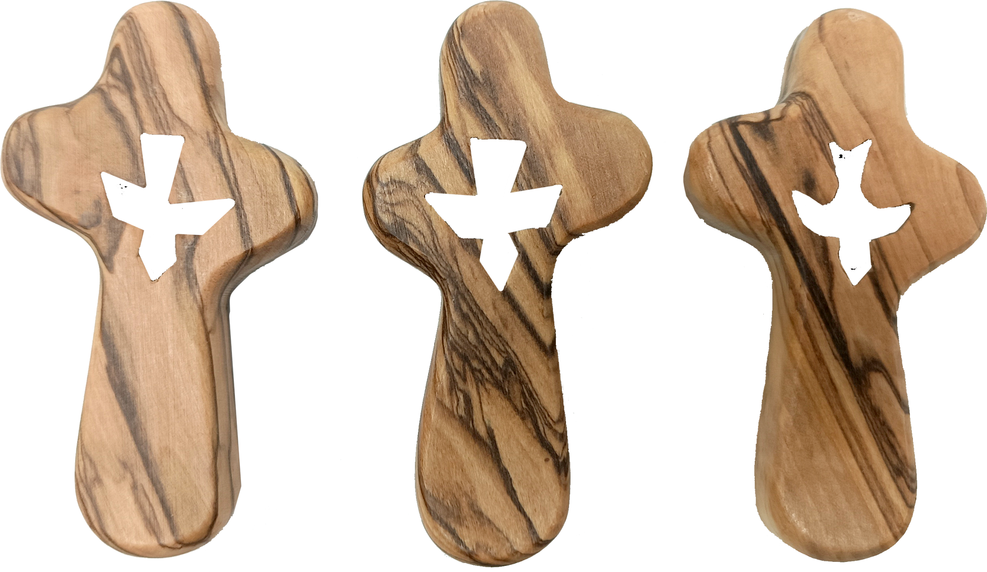Pick this up and you'll feel it settle right into your palm. That dove cut-out in the center isn't just decorative. It's carved by hand, and when your thumb finds it during prayer, it means something. This is a christian cross made from genuine olive wood, grown and pruned right here in the Holy Land, shaped by families who've been doing this work for generations.