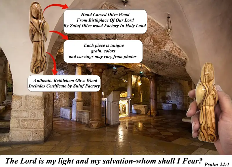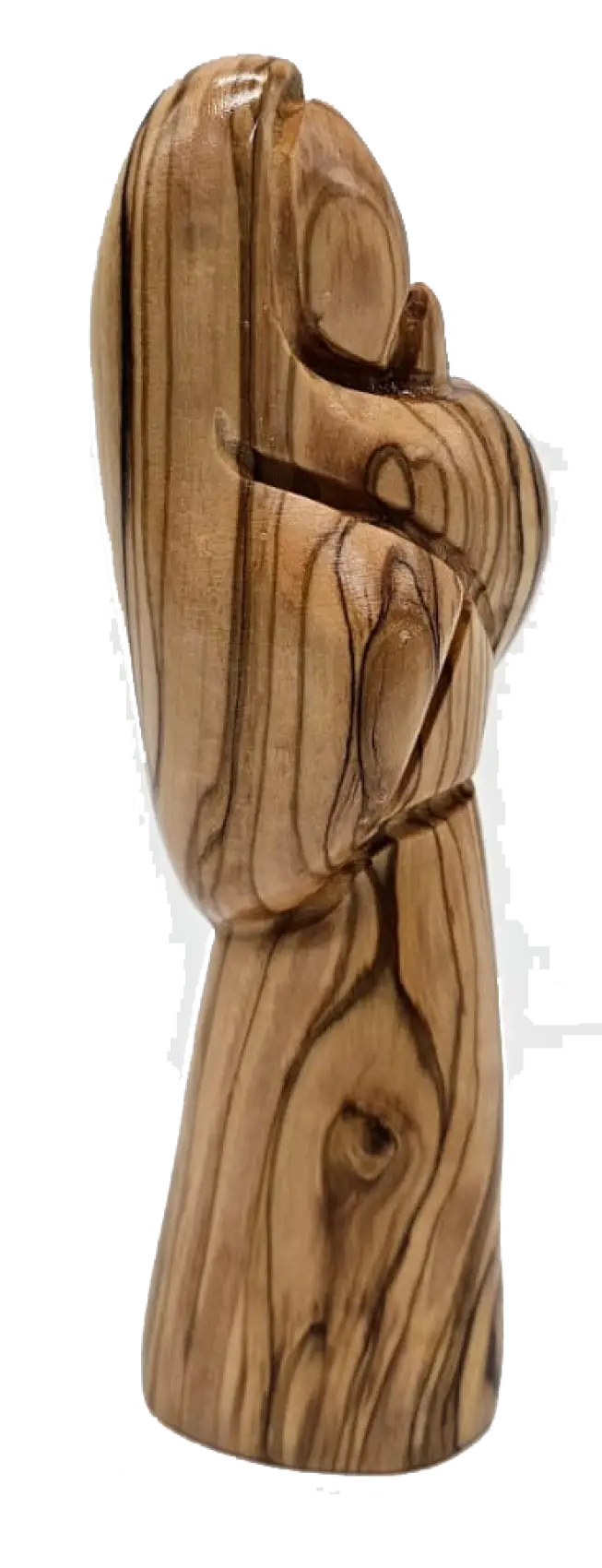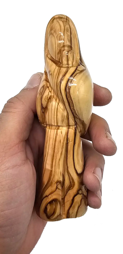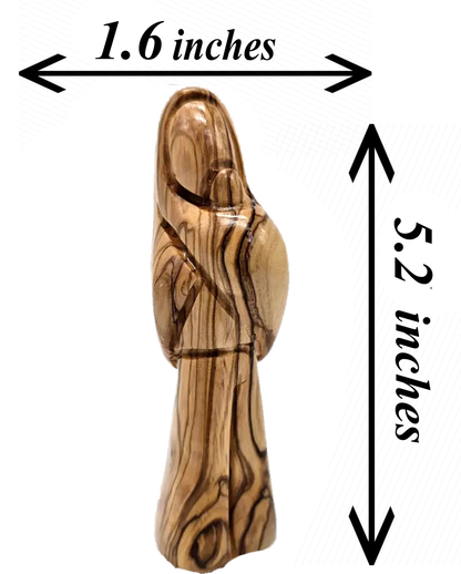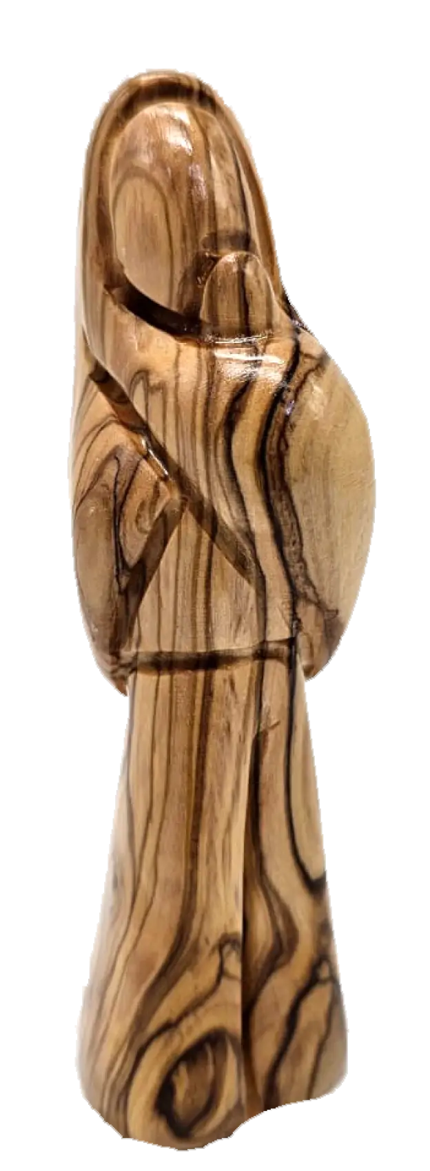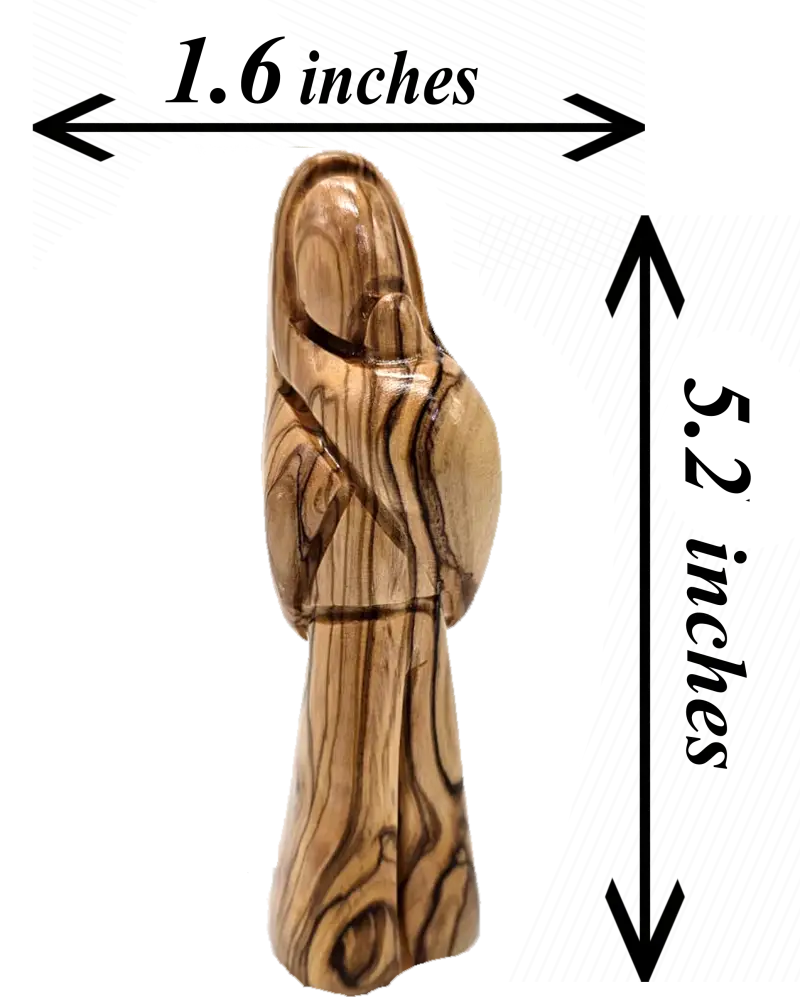 Here’s a small but special Virgin Mary olive wood statue , shows Mary holding baby Jesus in a soft, simple way. It's made by hand in Bethlehem by local Christian carvers, using real olive wood that comes from right there in the Holy Land.