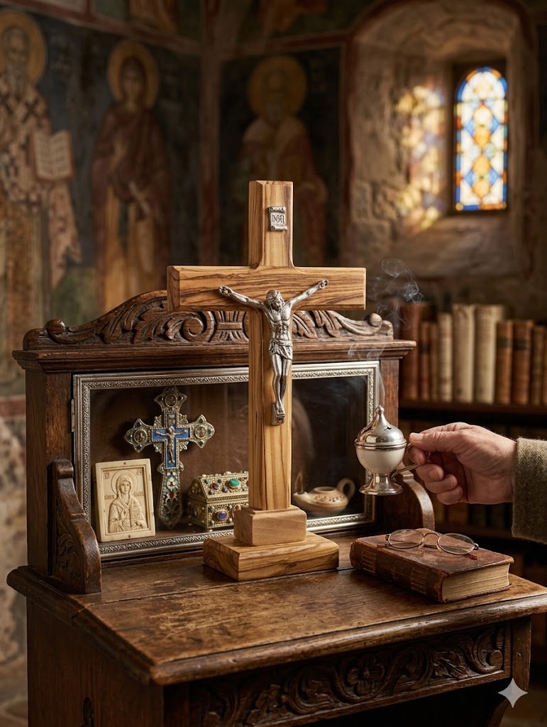 There's something about holding one of these that stops you. The olive wood is warm in your hand, and the metal corpus catches the light just right. It's not decorative in a generic way. It's devotional in a way you feel.