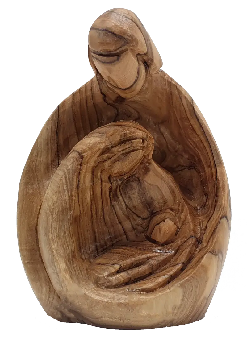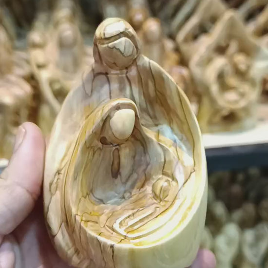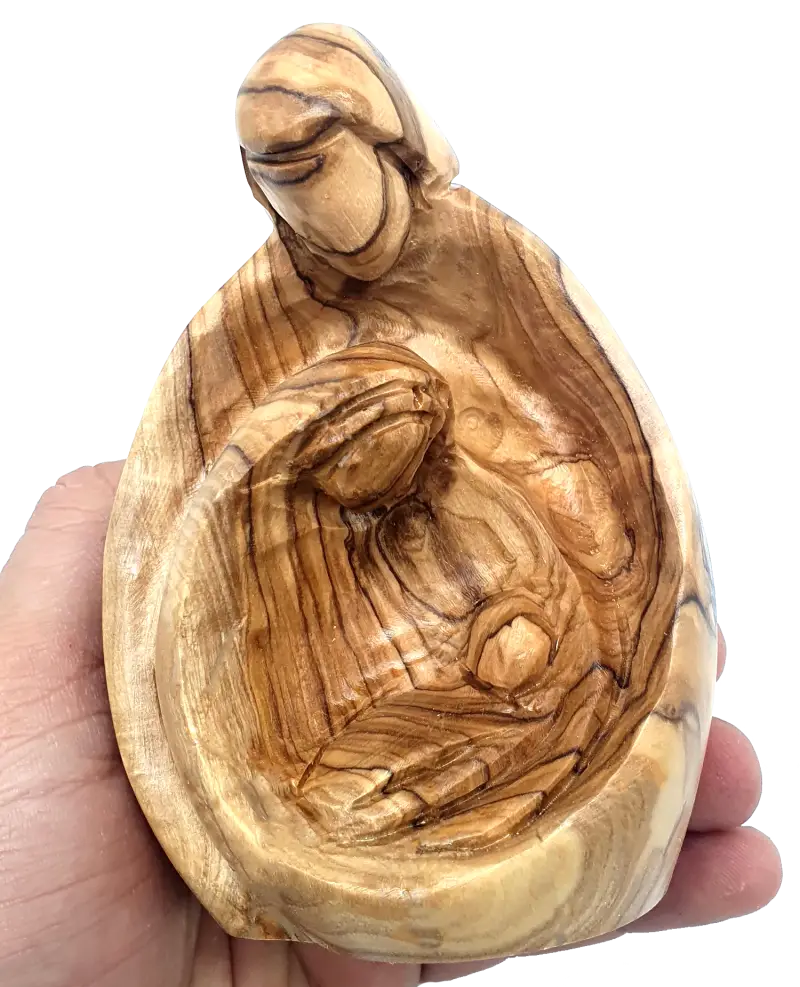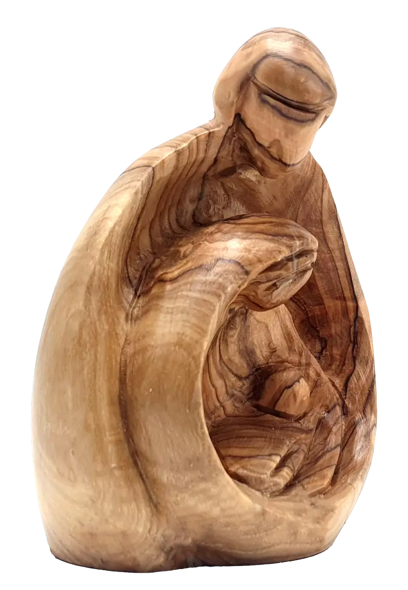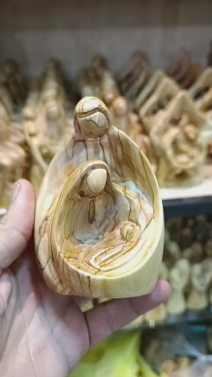 This little statue’s made by hand in Bethlehem using real olive wood. It shows Mary, Joseph, and baby Jesus, just standing together, quiet and simple. Nothing too polished. Just something honest and warm.
