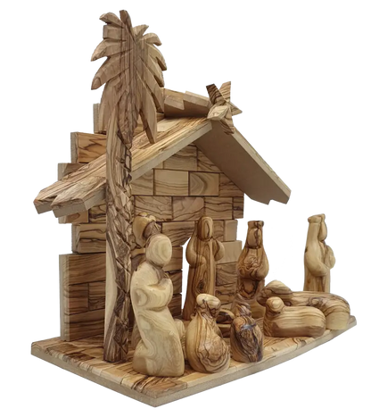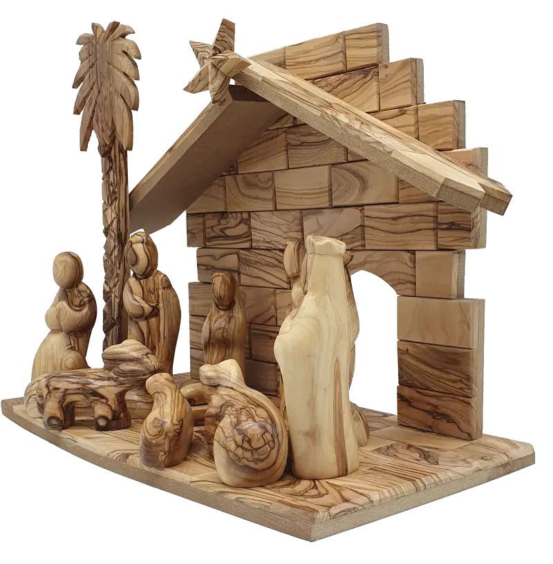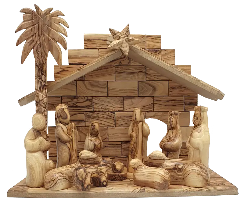 Celebrate the spirit of Christmas with this magnificent large olive wood nativity set intricately hand carved in Bethlehem from premium, sustainably sourced olive wood . This stunning set features 12 timeless figurines including Mary, Joseph, Baby Jesus, the Three Wise Men, shepherds, and animals, all enclosed within a beautifully detailed stable .