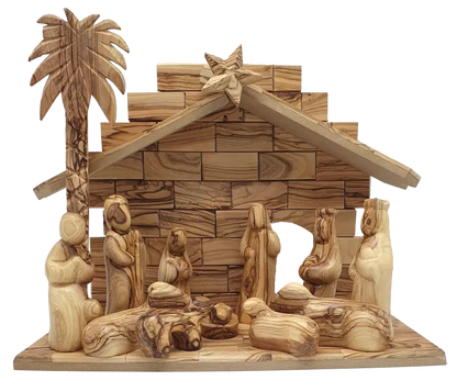 Large Hand-Carved Olive Wood Nativity Set with Stable – 12-Piece Holy Family from Bethlehem
