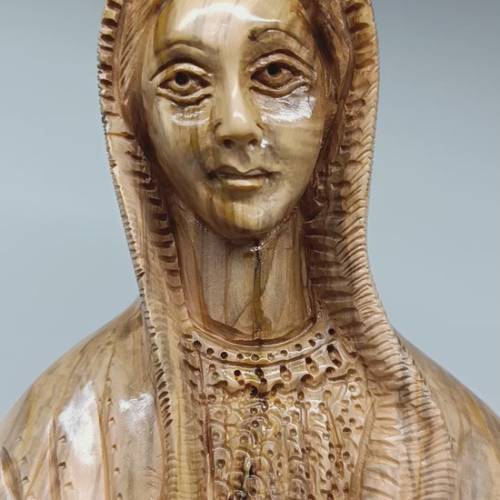 The Virgin Mary is shown in a peaceful prayerful posture, with gentle facial features and flowing robes that reveal the natural beauty and grain of the olive wood . Every detail is carefully carved by hand, allowing the warm tones and unique patterns of the wood to enhance the spiritual presence of the piece . No two statues are ever the same .