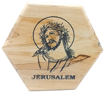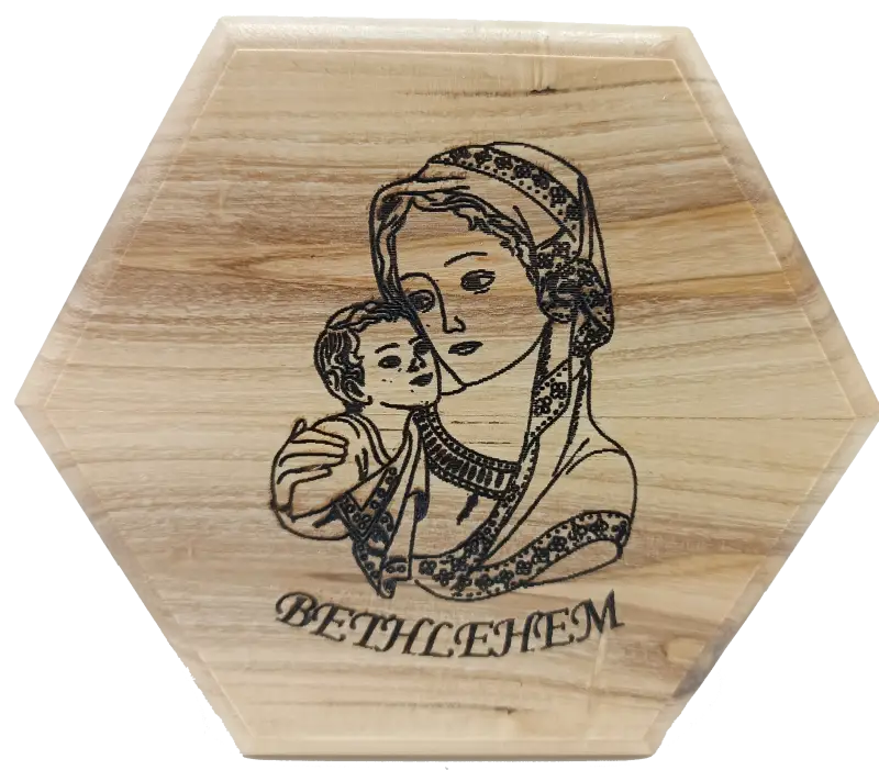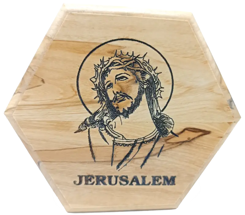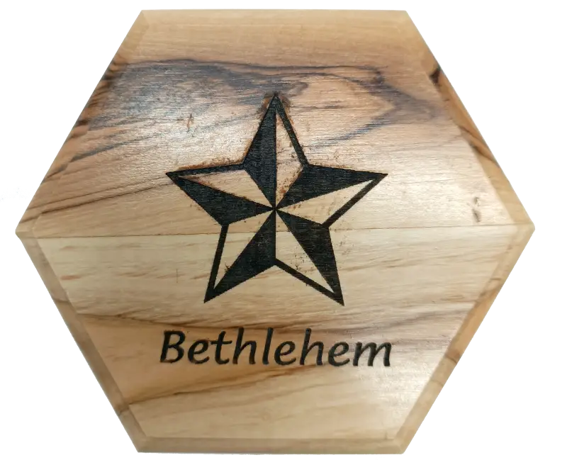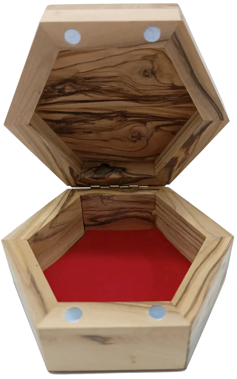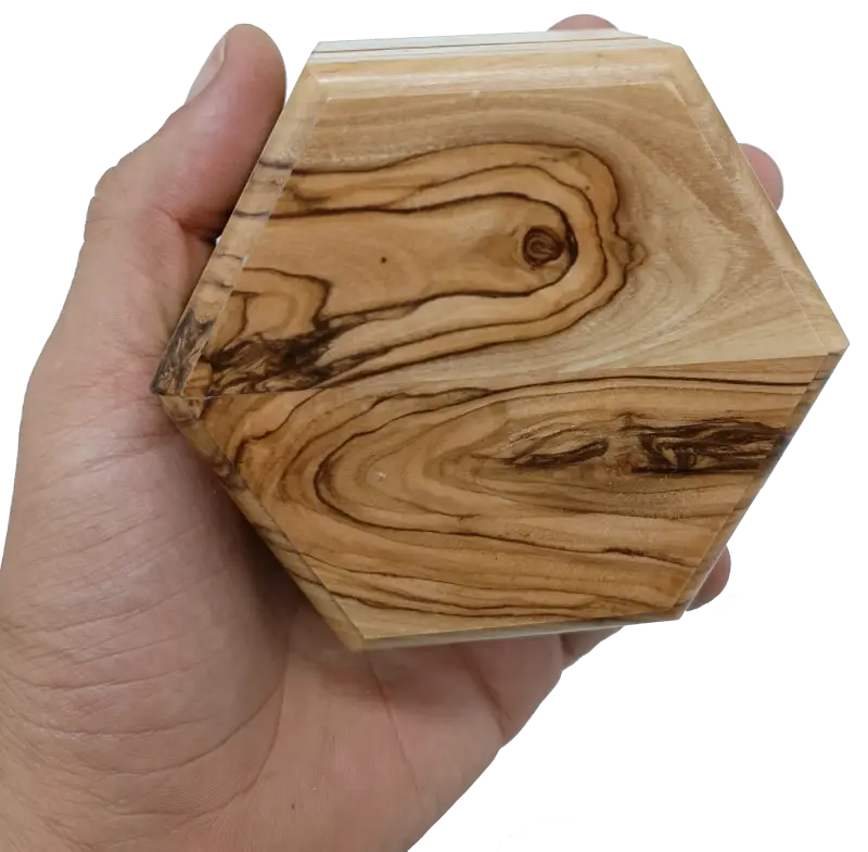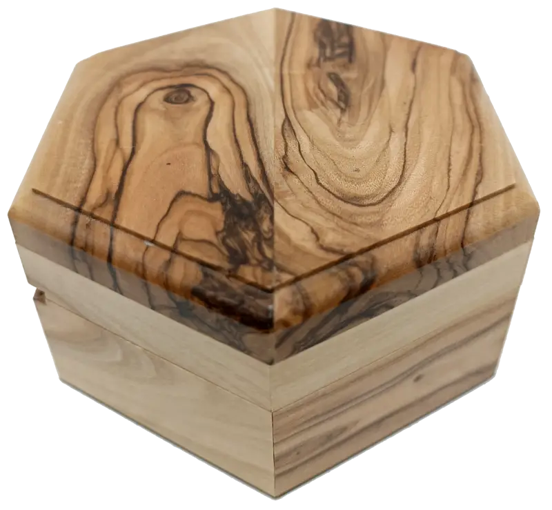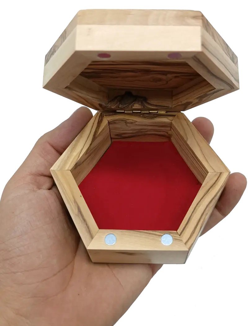Whether used as a special gift, a personal keepsake, or a devotional box, this hand crafted olive wood hexagon box brings a touch of the Holy Land into your home . Its meaningful artistry and quality construction make it a cherished item for years to come .