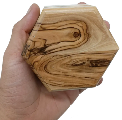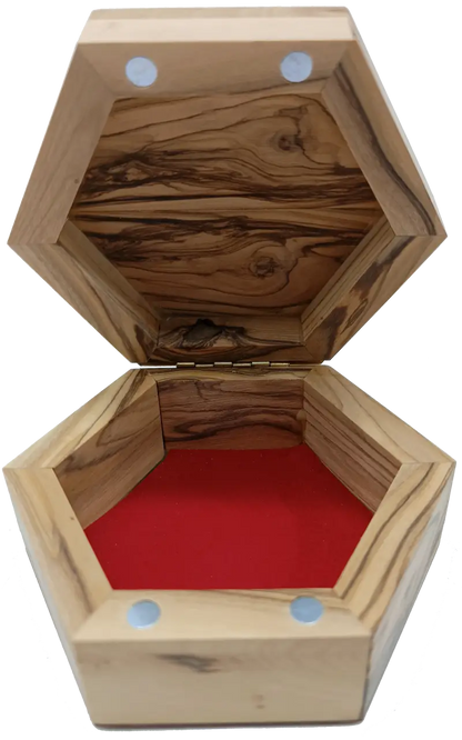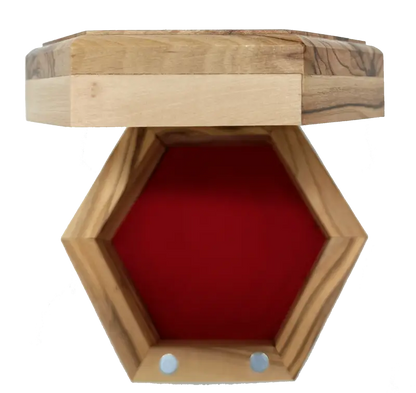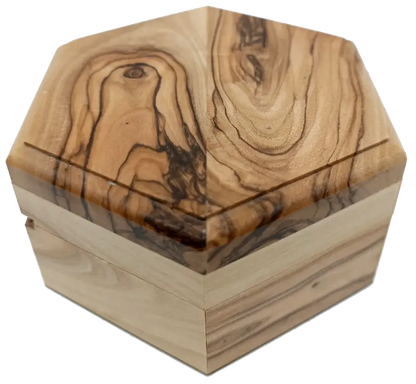 Crafted with precision by skilled Christian artisans in Bethlehem, this large hexagon keepsake box is made from genuine olive wood, renowned for its distinct grain patterns, warm earthy tones, and natural luster . The olive tree, deeply rooted in the history and symbolism of the Holy Land, brings spiritual depth to this elegant storage box .
