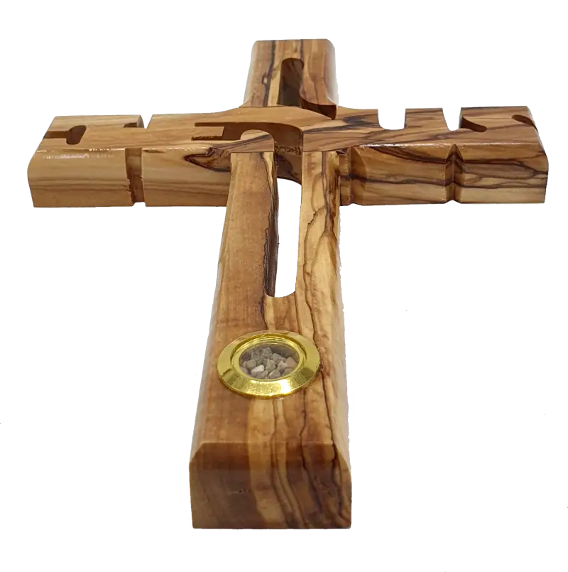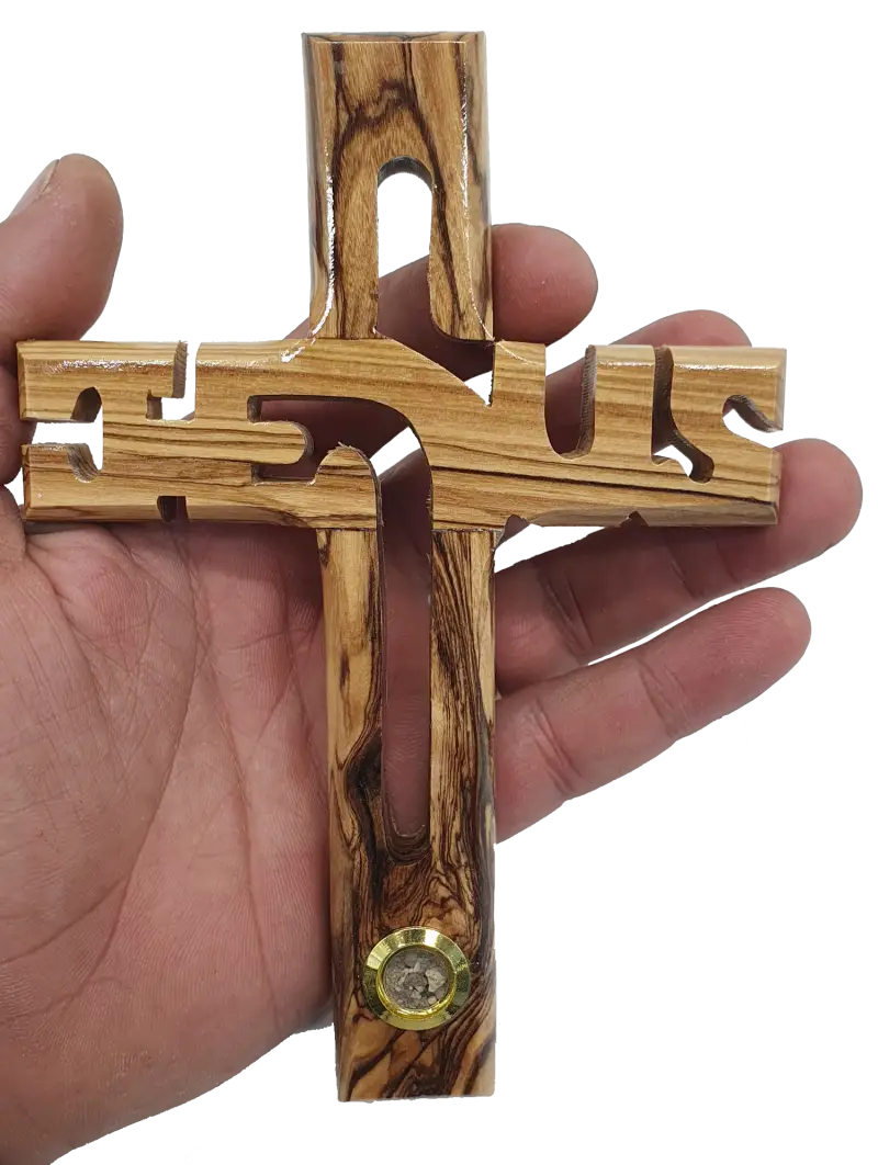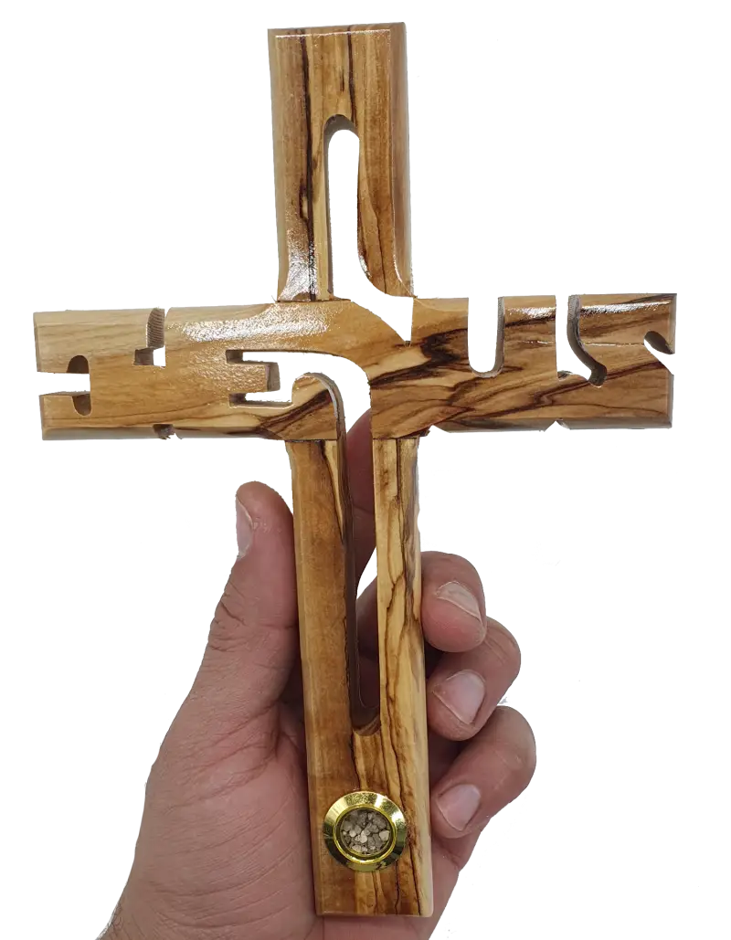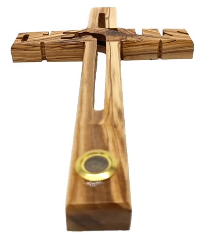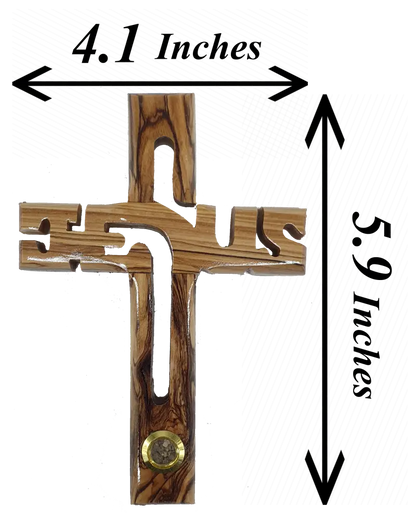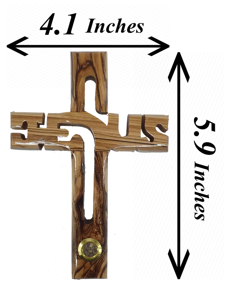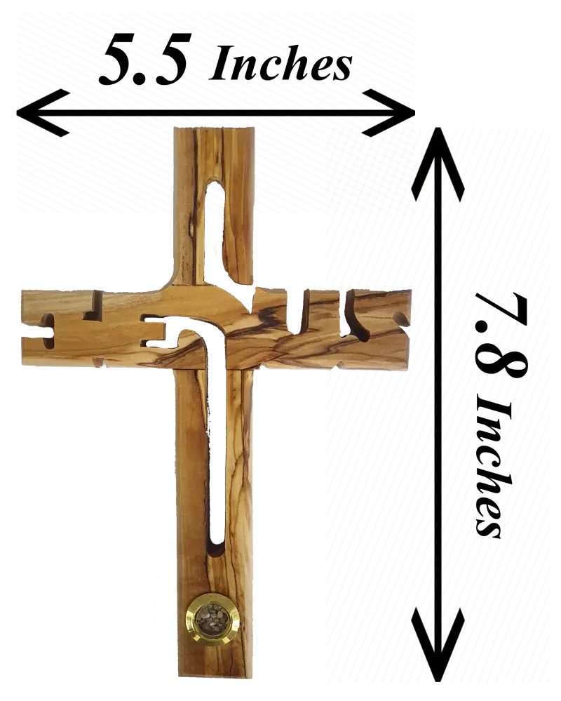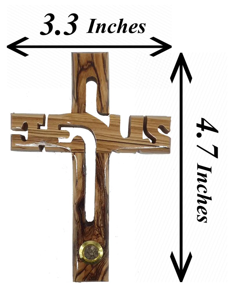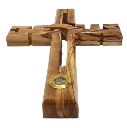Hand made Olive Wood Jesus Cross with Capsule of Holy Land Earth