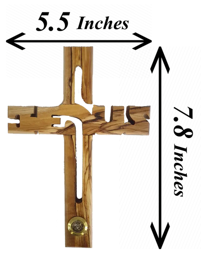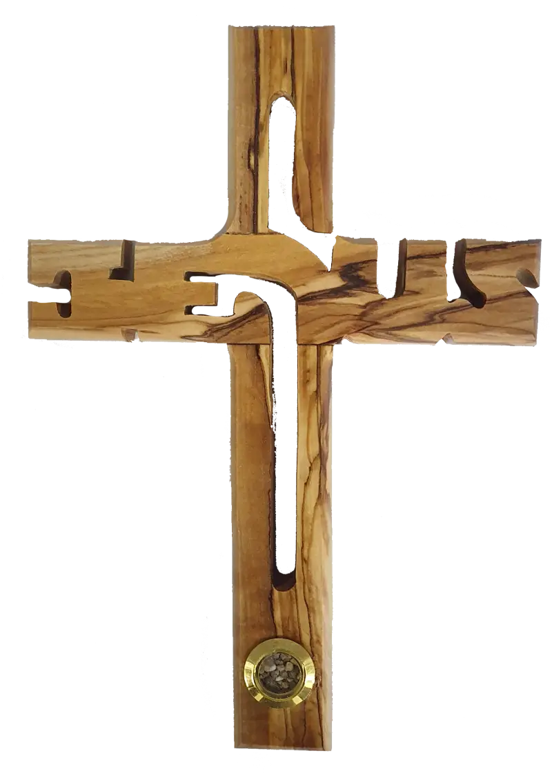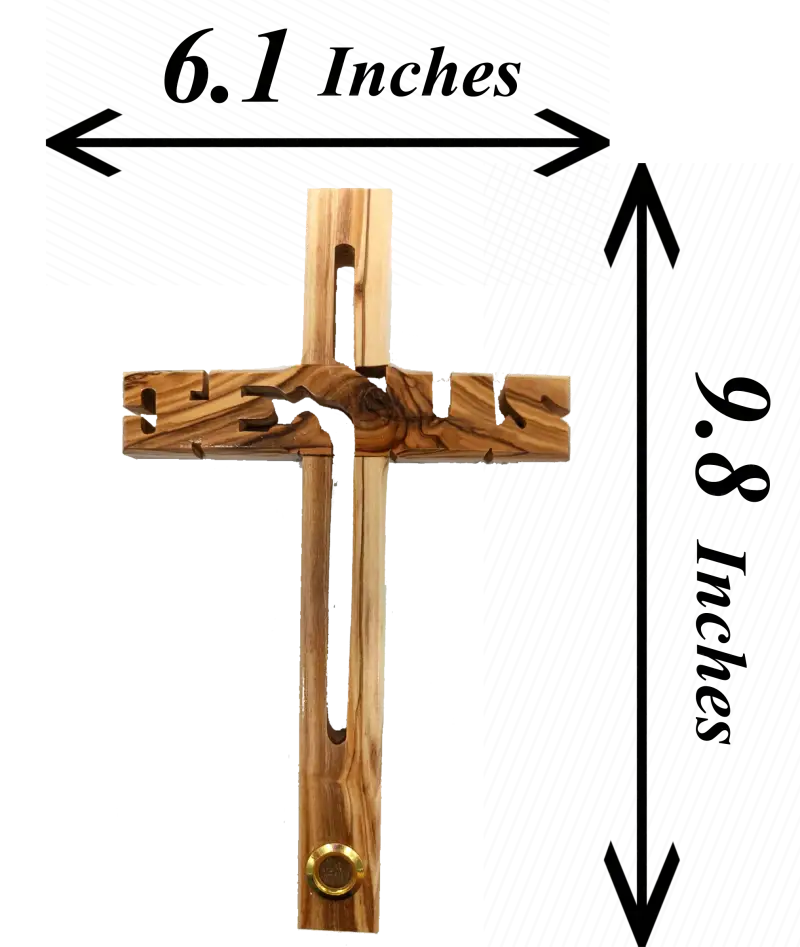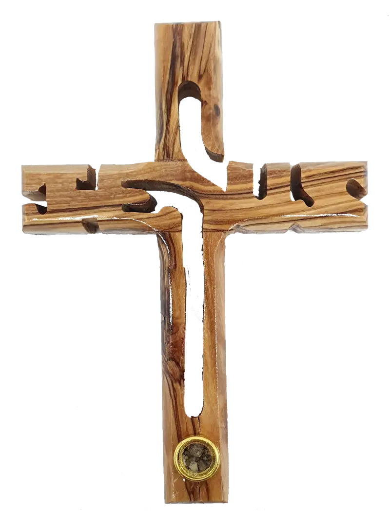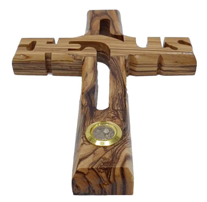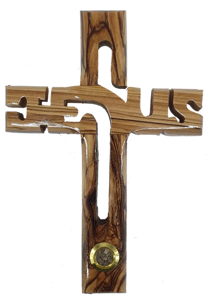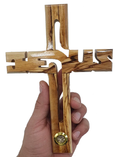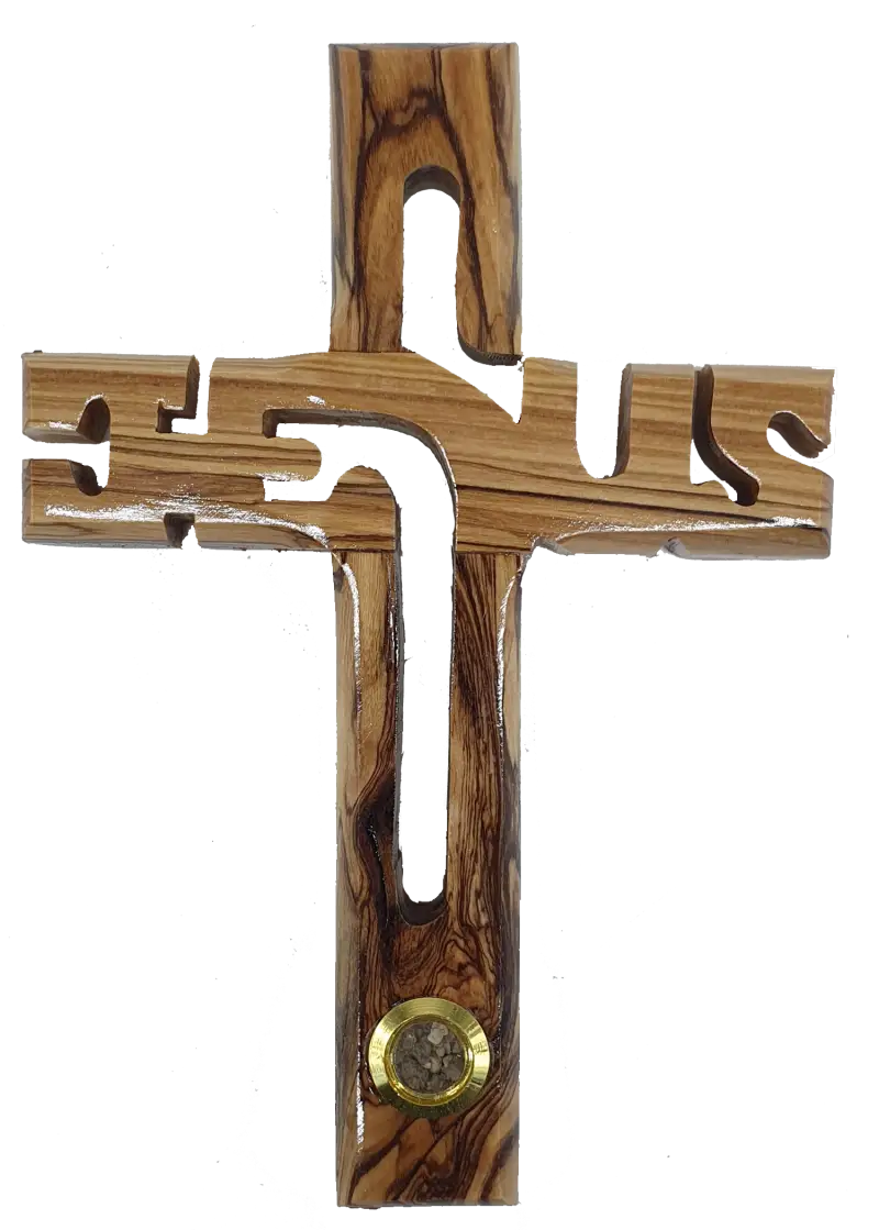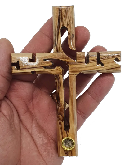 Hand made Olive Wood Jesus Cross with Capsule of Holy Land Earth