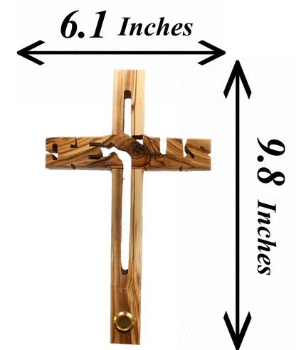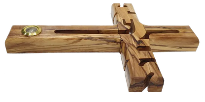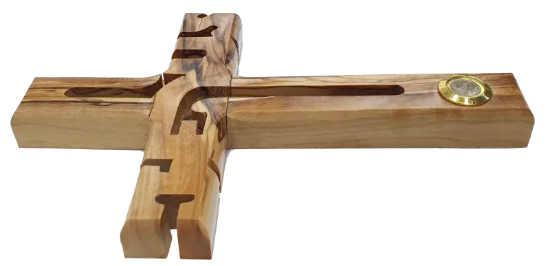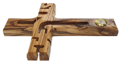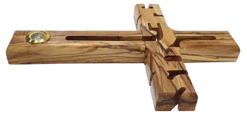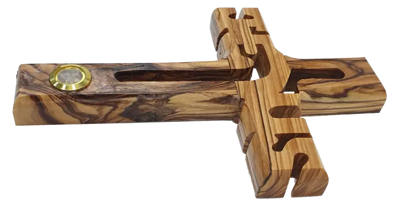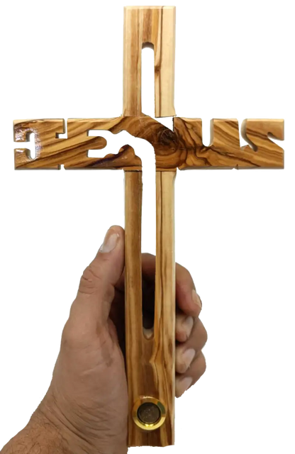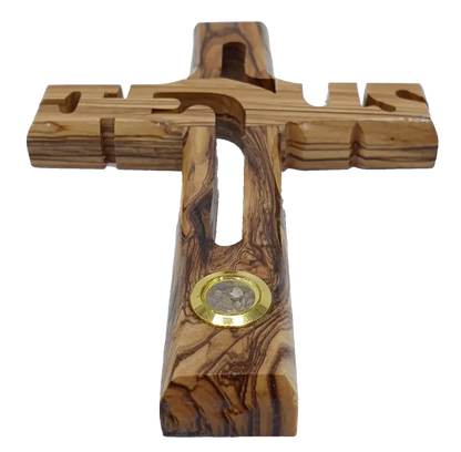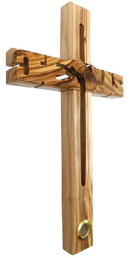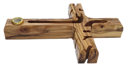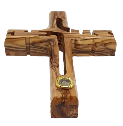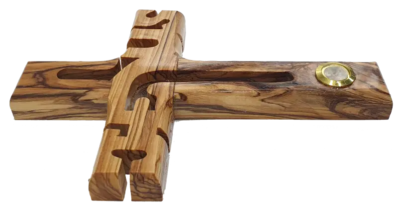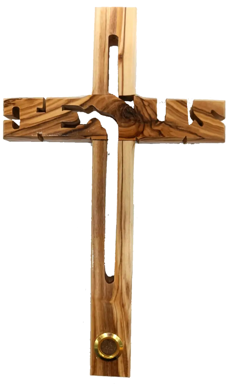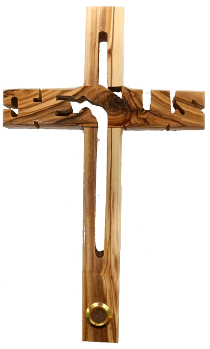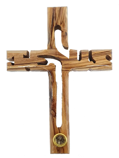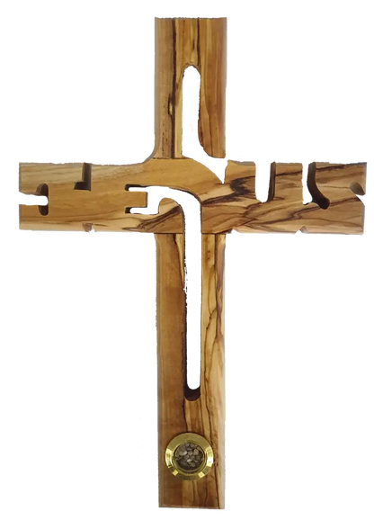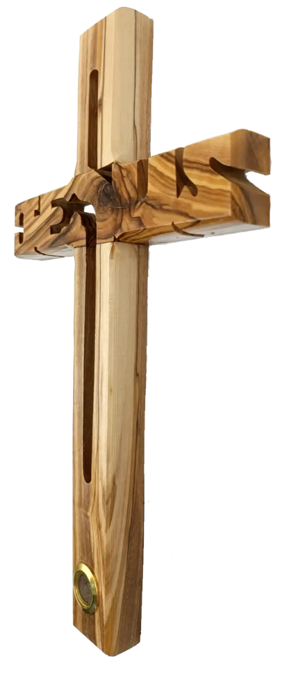Hand made Olive Wood Jesus Cross with Capsule of Holy Land Earth