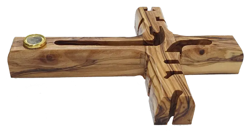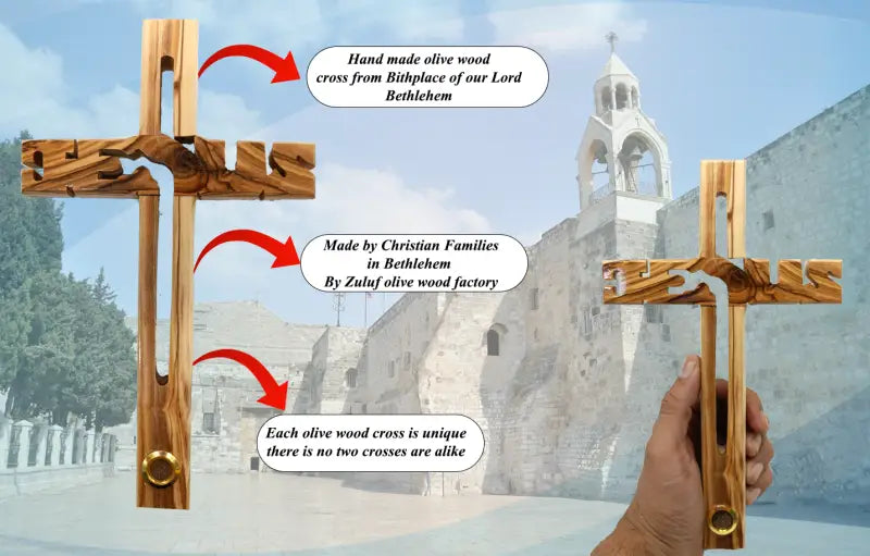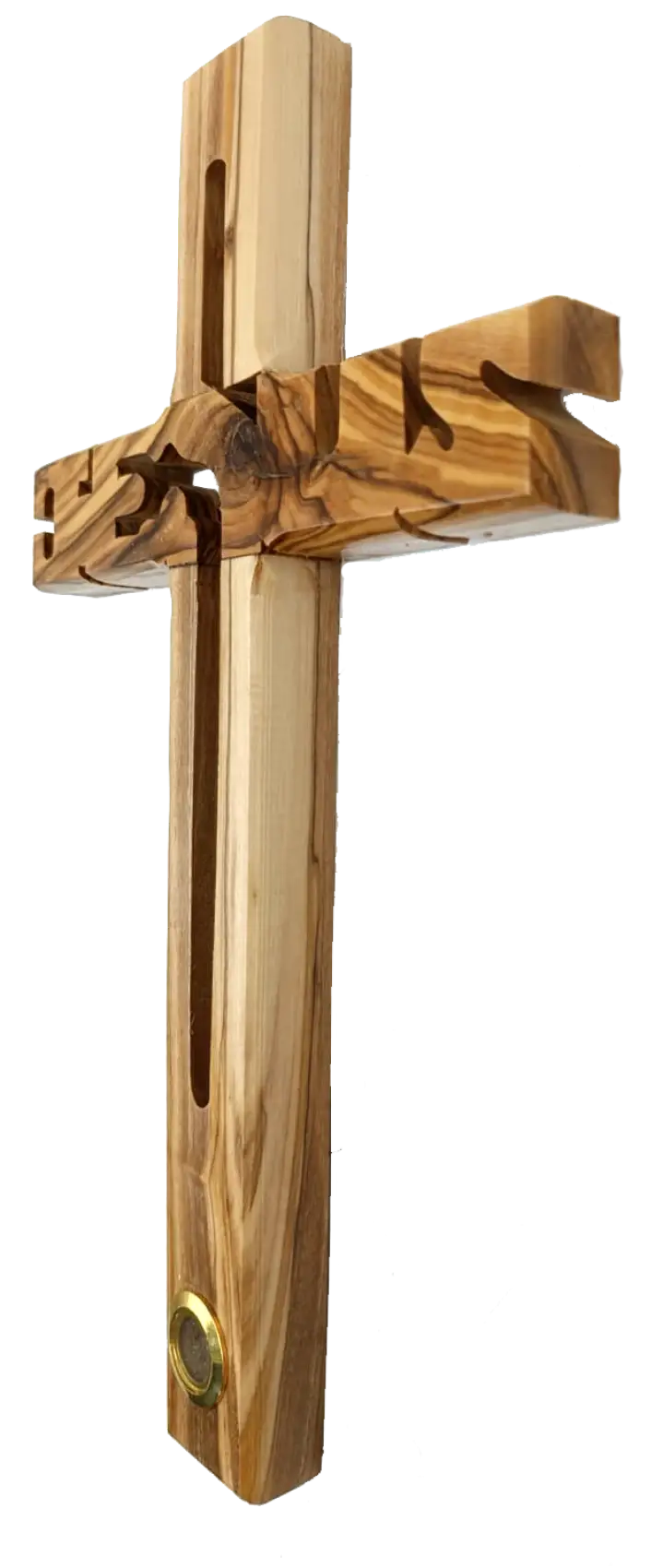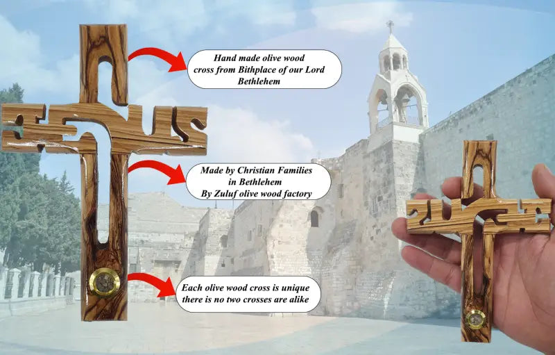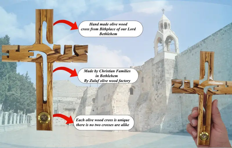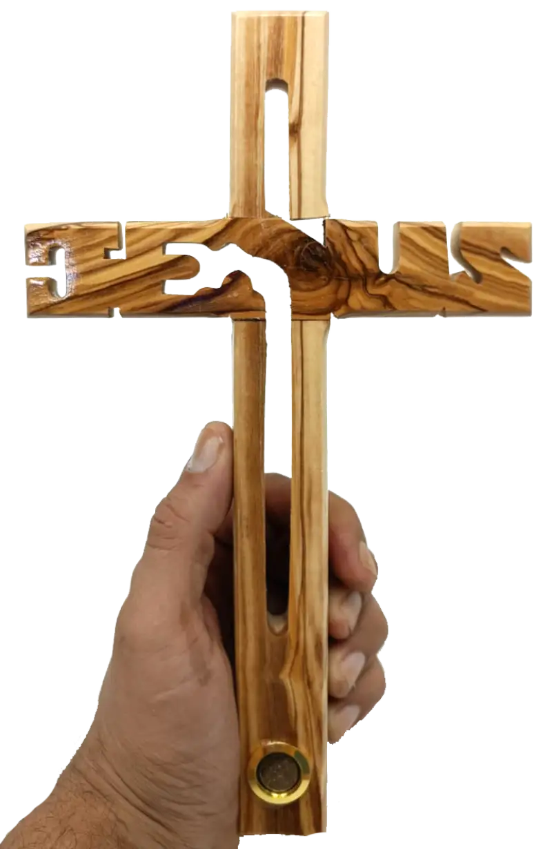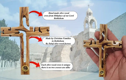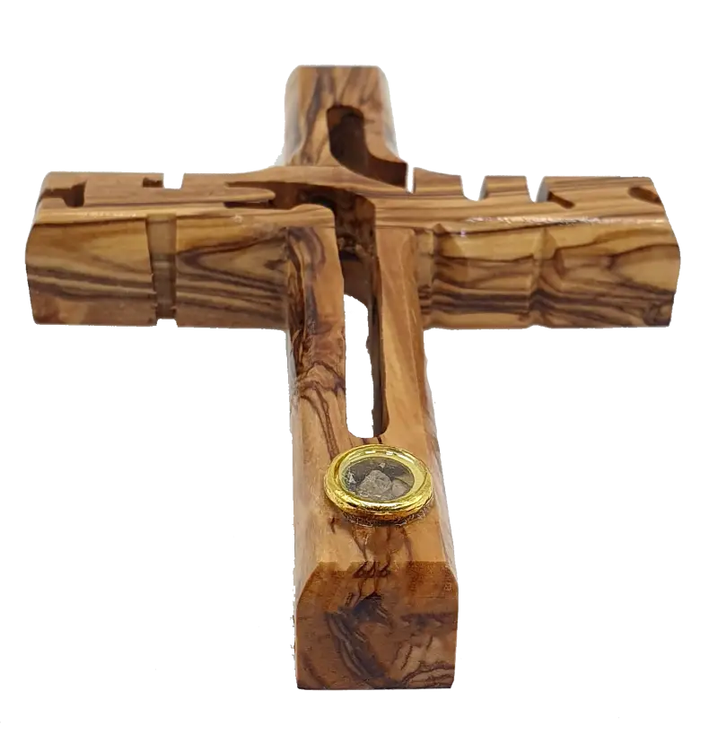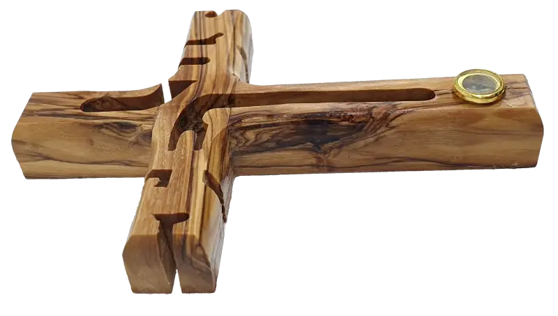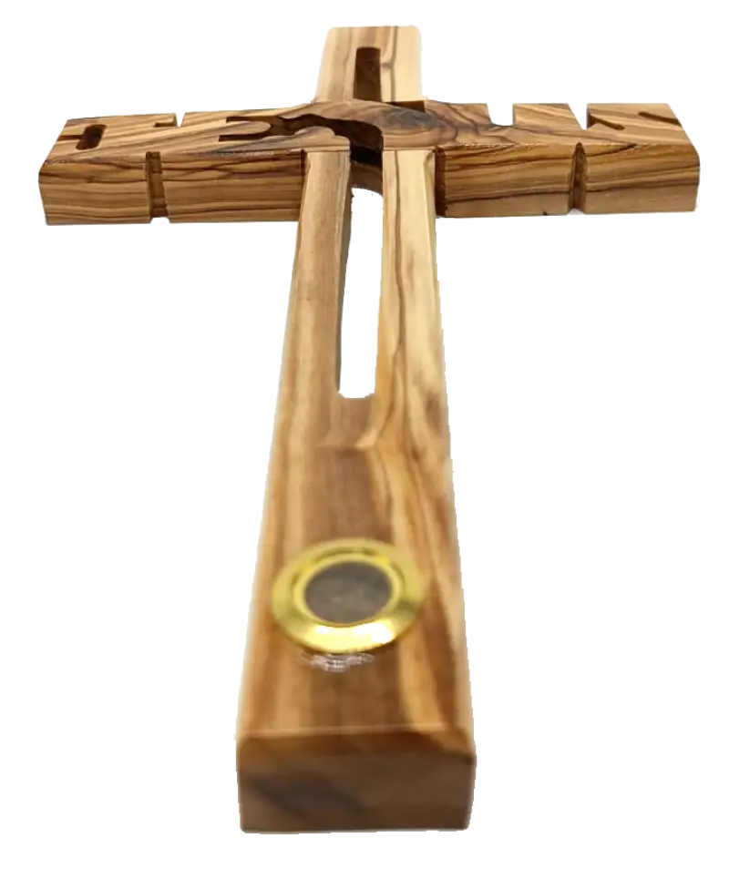 This wooden cross isn’t just something nice to hang, it’s made by hand from real olive wood grown in the Holy Land, where Jesus walked . Inside, there’s a small capsule filled with soil from the very earth of Bethlehem .