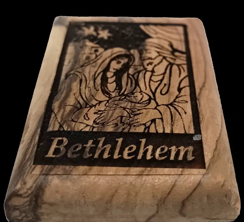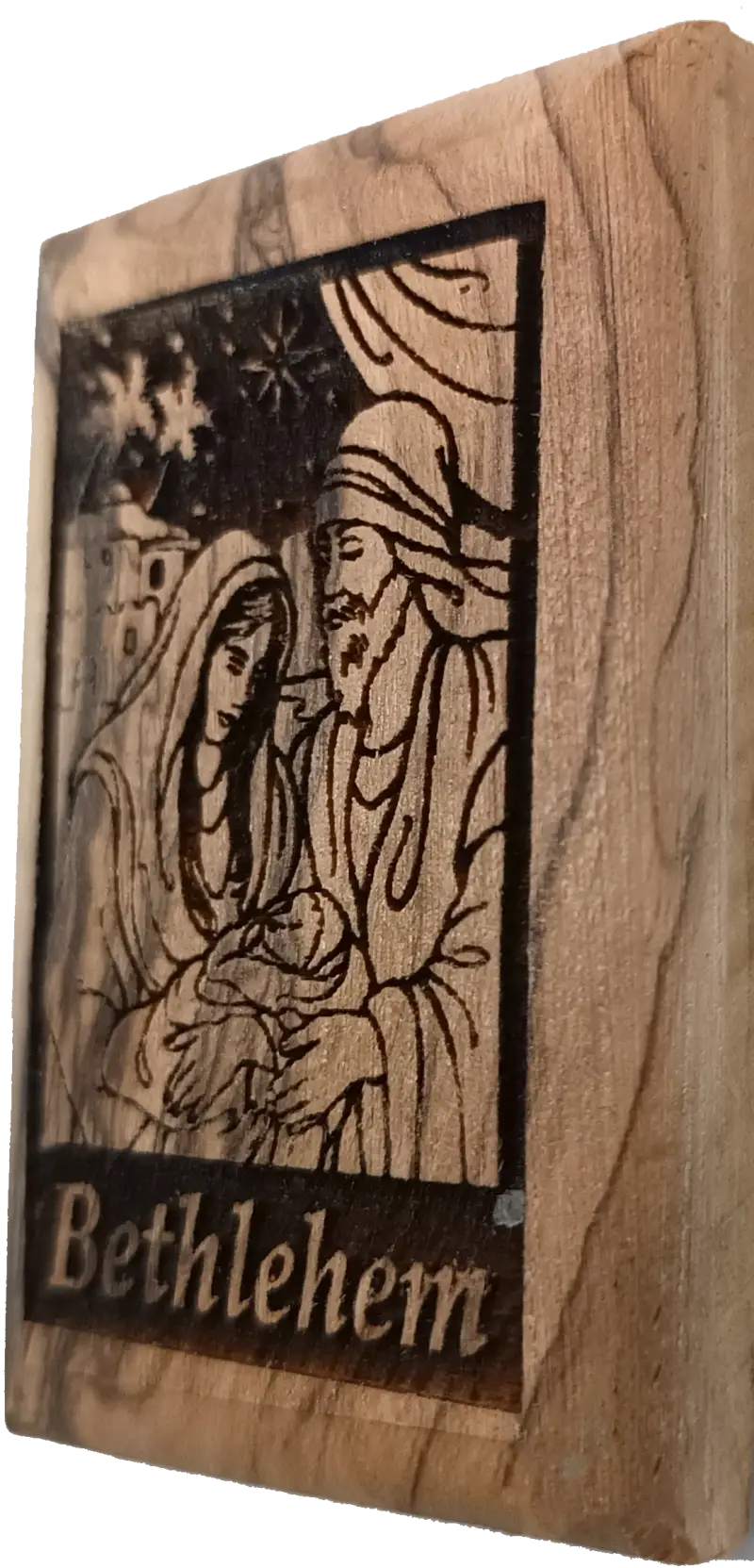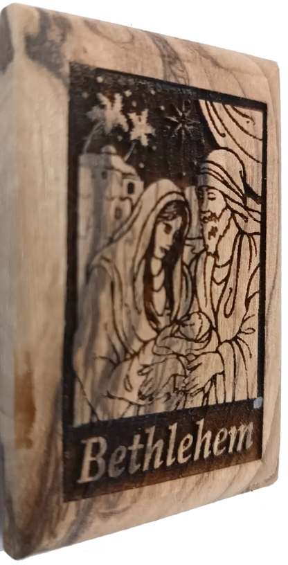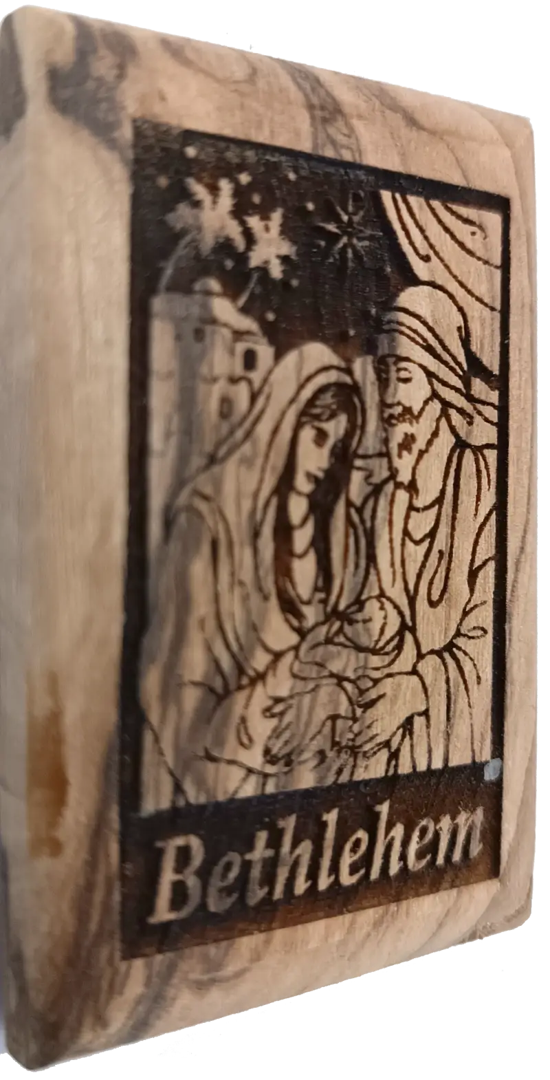 This olive wood magnet shows the Holy Family – Mary, Joseph, and Baby Jesus – gathered together in a peaceful and loving scene. Below the image, the word “Bethlehem” is engraved, honoring the sacred place where Jesus was born .