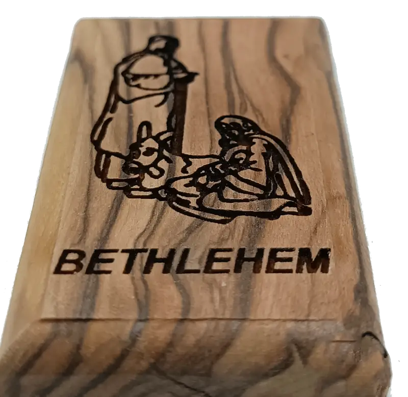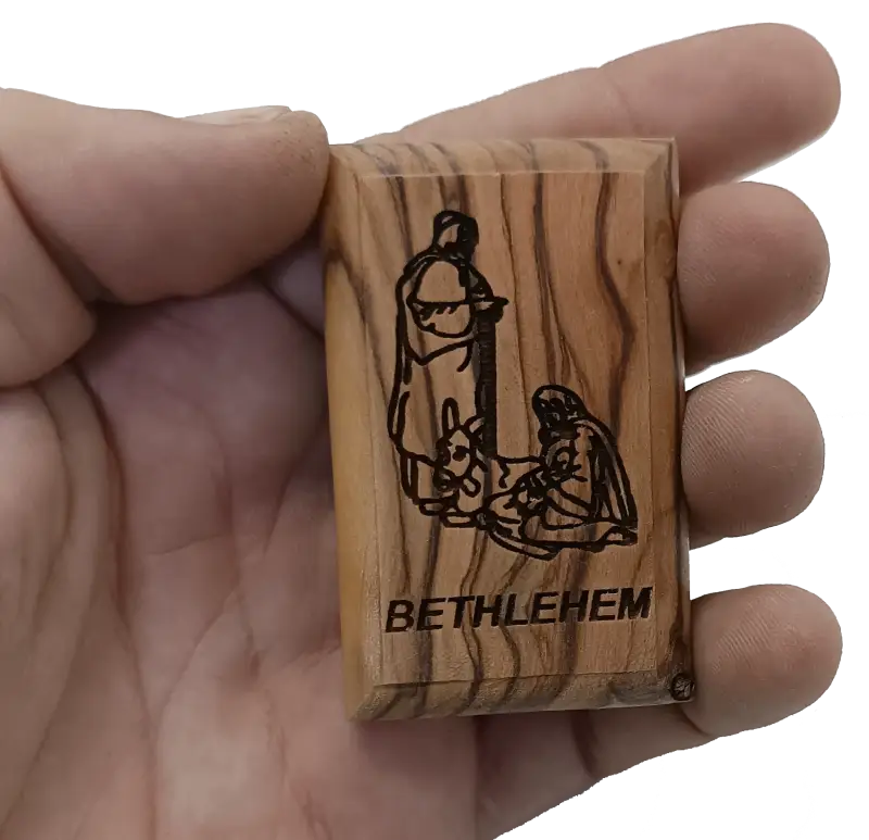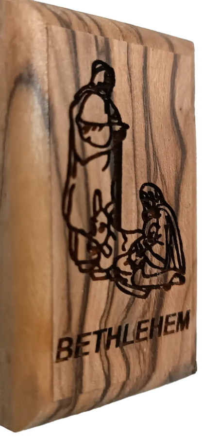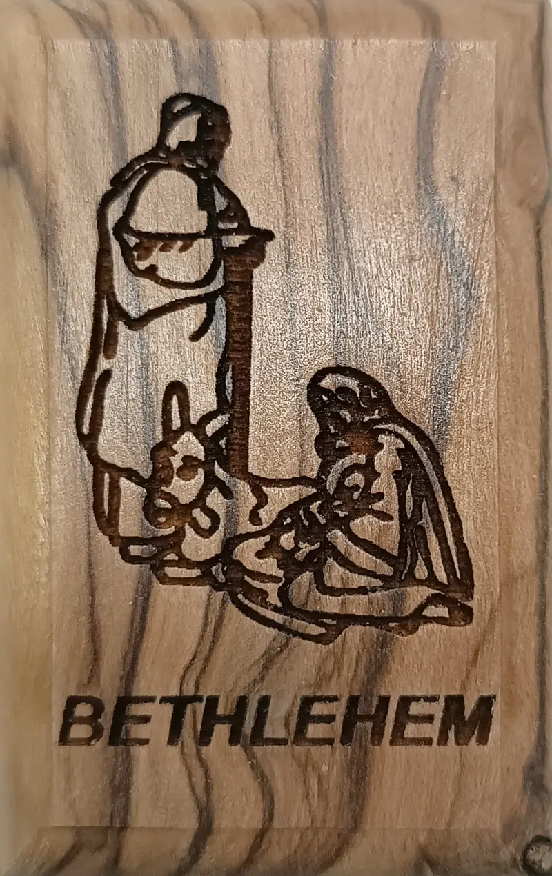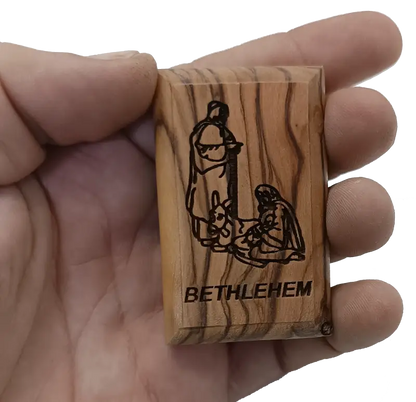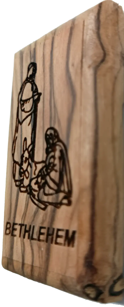 Engraved with “Bethlehem”, each magnet is handcrafted from genuine olive wood sourced from the Holy Land . The natural wood grain makes every piece unique, filled with meaning and spiritual significance .