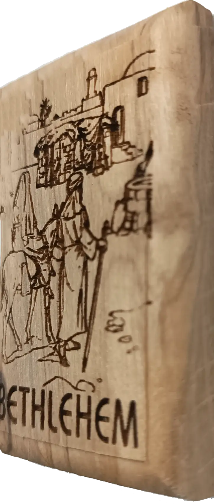 This olive wood magnet shows a quiet and touching moment , Mary and Joseph arriving in Bethlehem, just before the birth of Jesus . You can almost feel the journey in the carving, with Mary on a donkey and Joseph walking beside her, staff in hand. The word “Bethlehem” is engraved below, grounding the piece in the place where the story began .