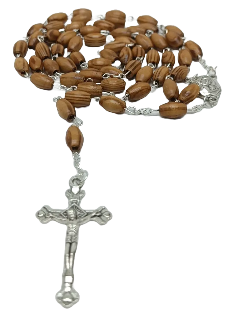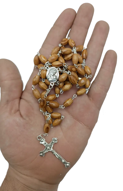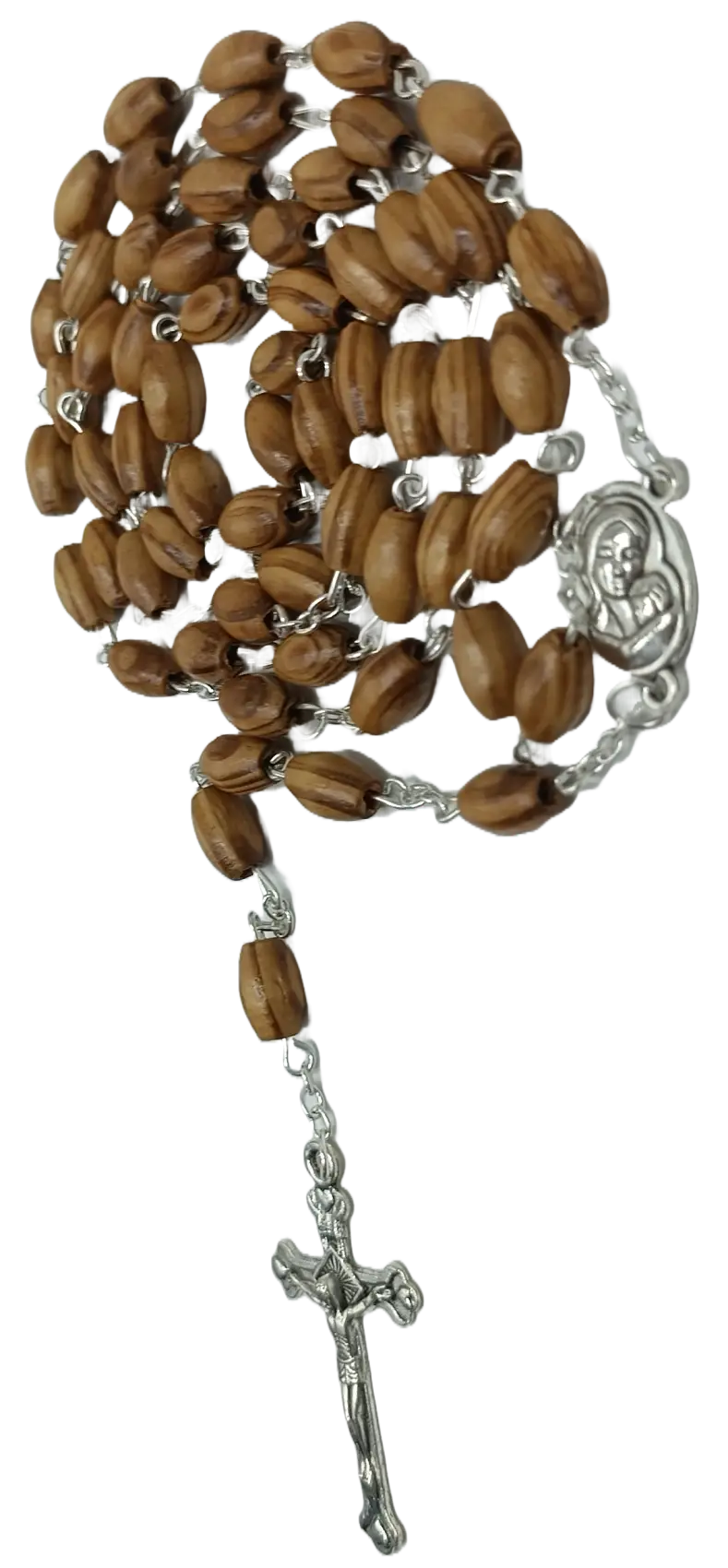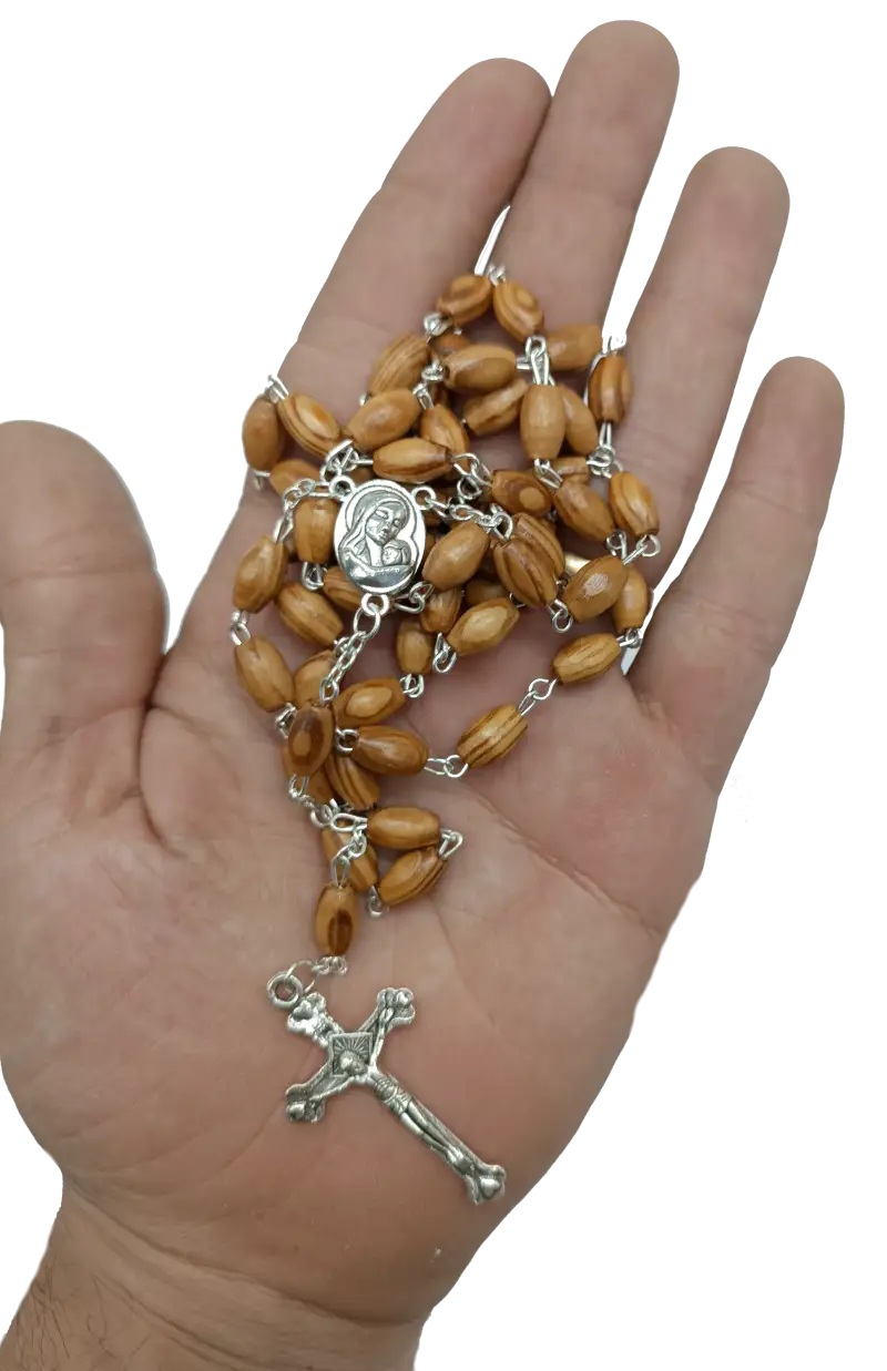 This finely crafted rosary blends the warmth of genuine olive wood with the strength of silver-tone metal, creating a beautiful and lasting devotional piece . Each bead is hand-shaped from authentic olive wood grown in the Holy Land, giving it a smooth, natural feel and a unique grain that reflects the land it comes from .