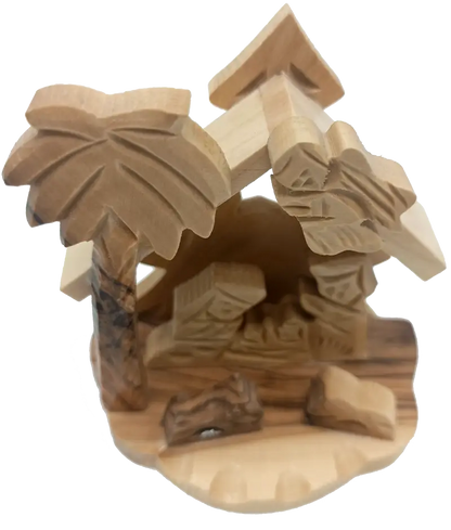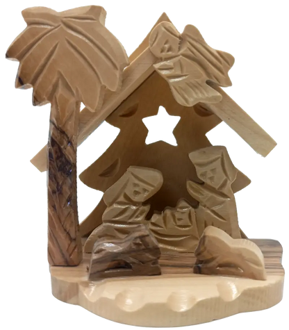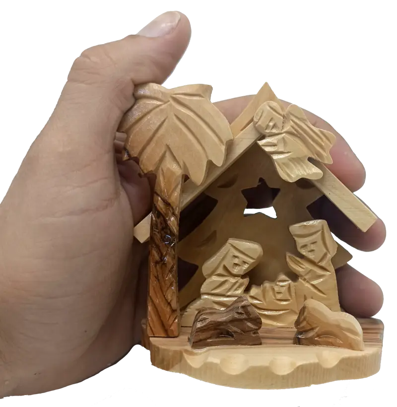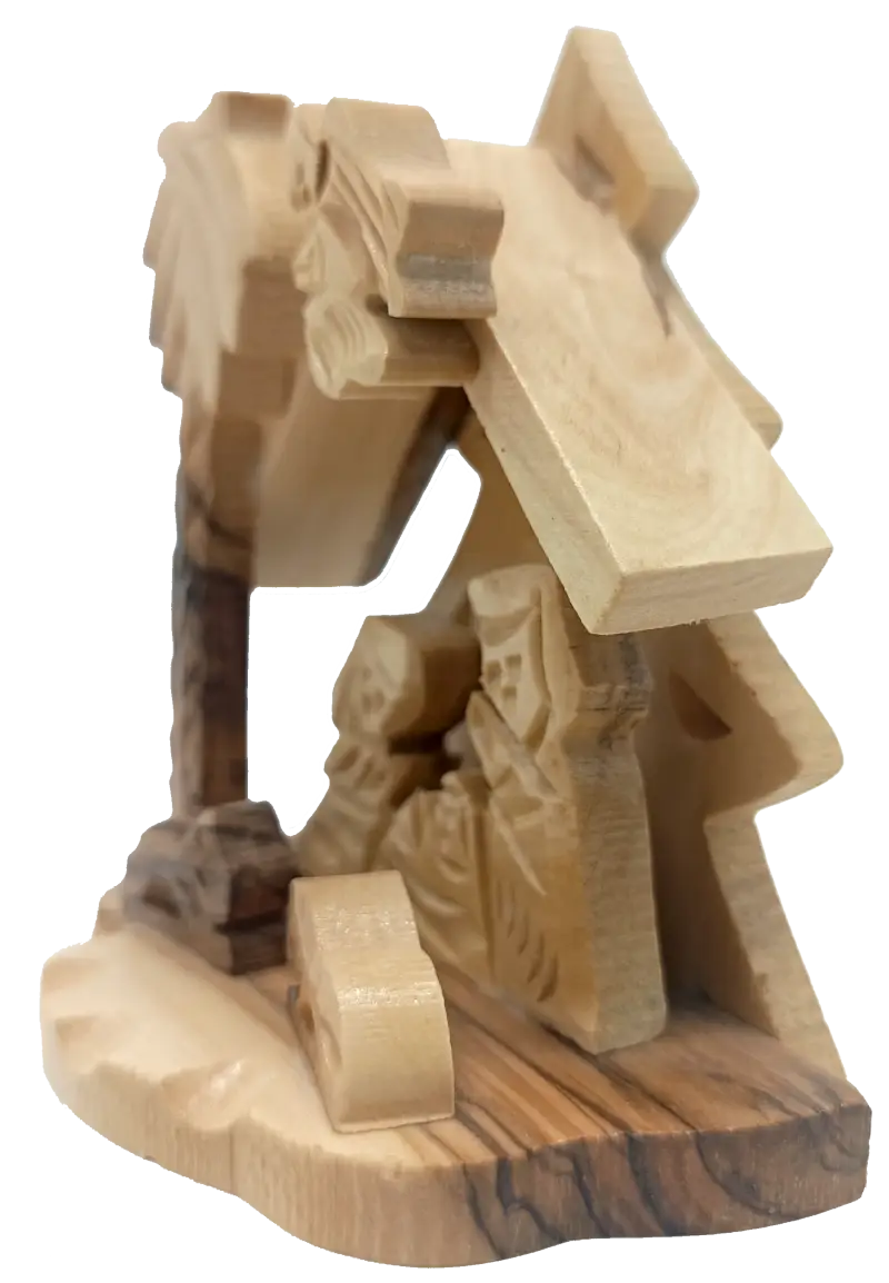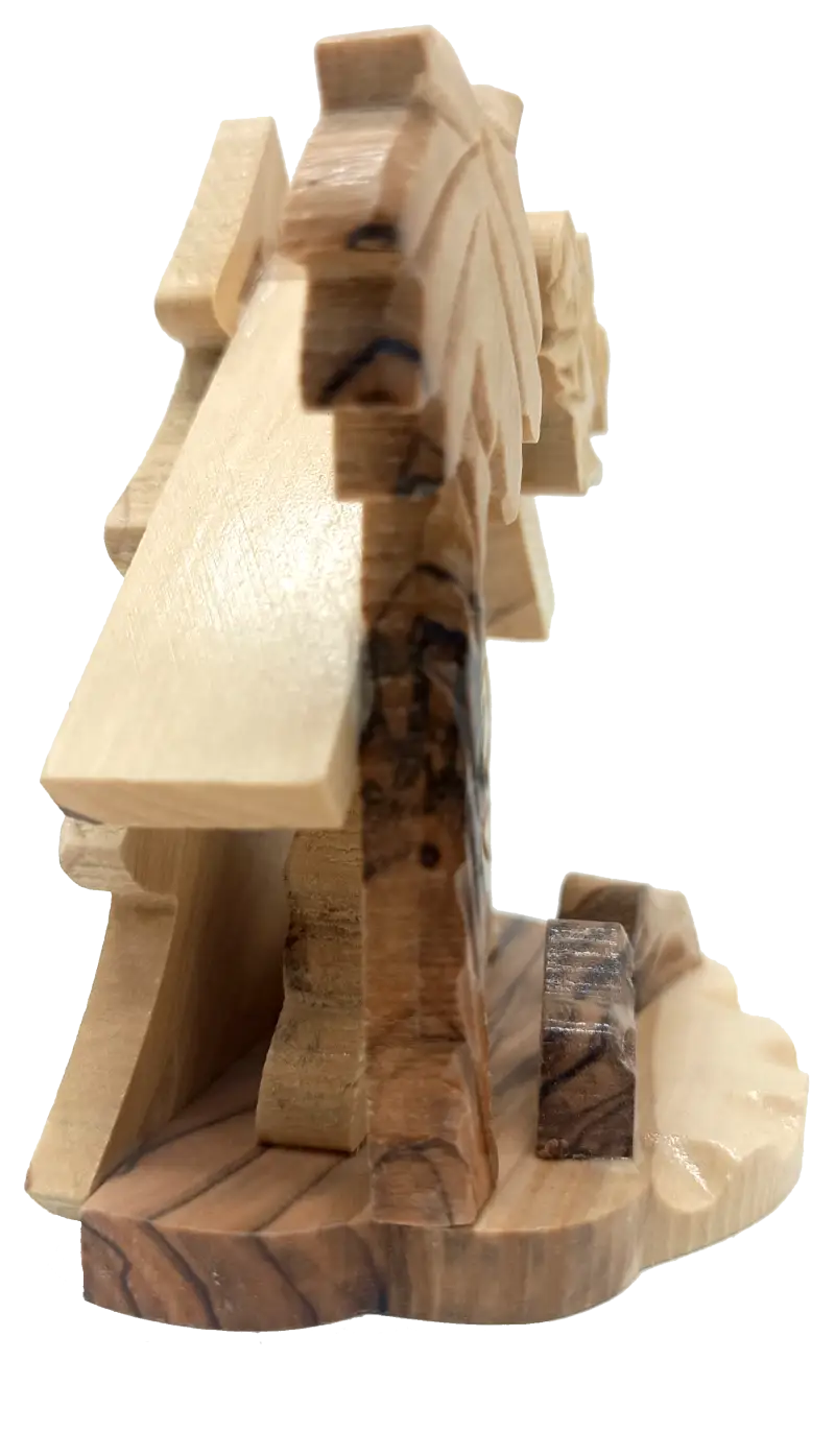 A beautifully sculpted angel watches from above, while a palm tree stands nearby, adding a touch of Bethlehem’s landscape to the scene. The star shaped cutout in the backdrop gently lets in light, enhancing the warmth and character of the rich olive wood grain .