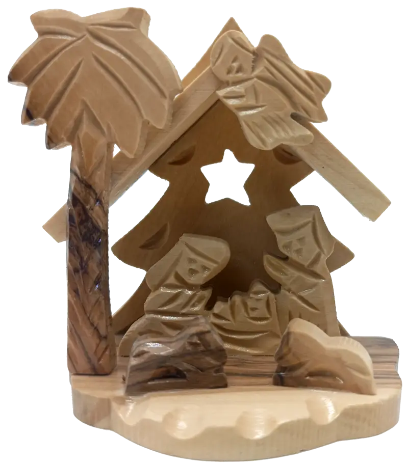 - Features the Holy Family, a carved angel, star-shaped cutout, and palm tree .