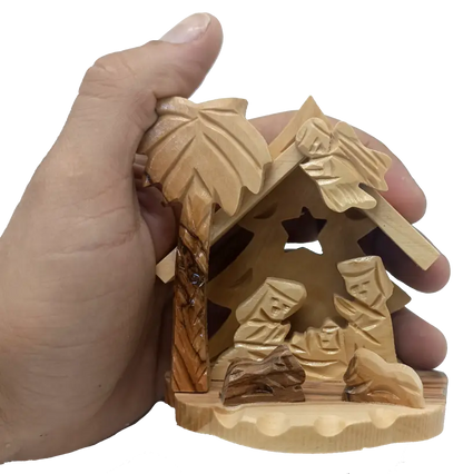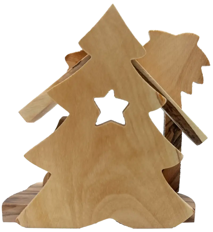 olive wood nativity Bethlehem, Holy Family nativity scene with star, hand-carved Christmas décor, tree-shaped nativity ornament, Christian gift from Holy Land, handmade wooden nativity with angel, compact nativity set, spiritual Christmas gift Bethlehem