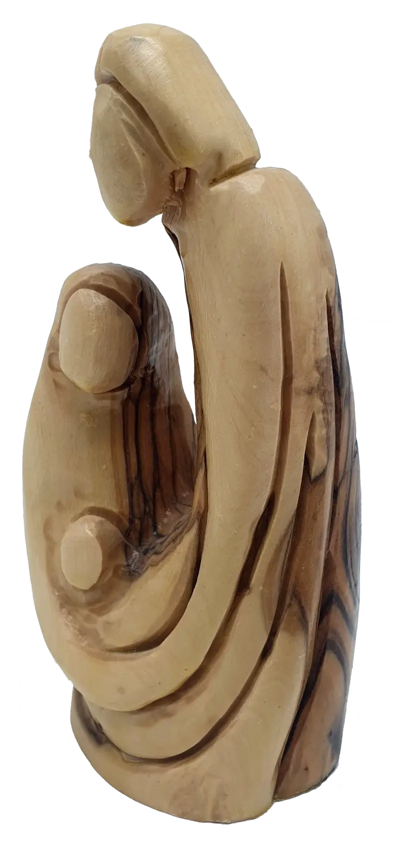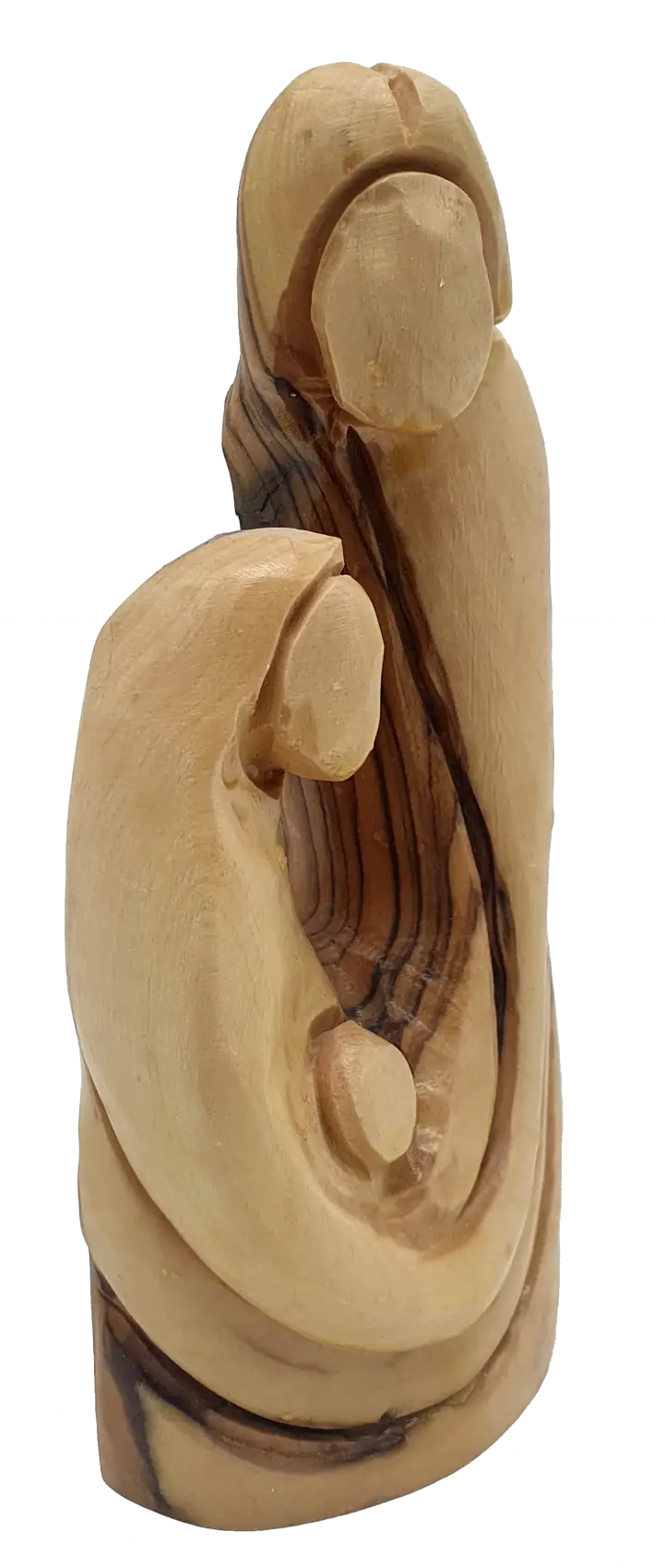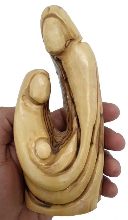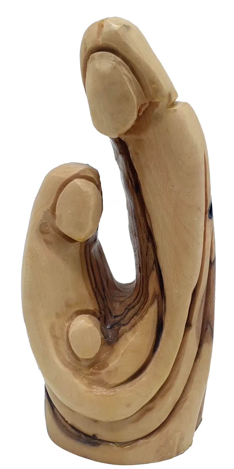 This little Holy Family statue is made by hand from real olive wood, carved right in Bethlehem. It shows Mary, Joseph, and baby Jesus together, just in a quiet and simple way.