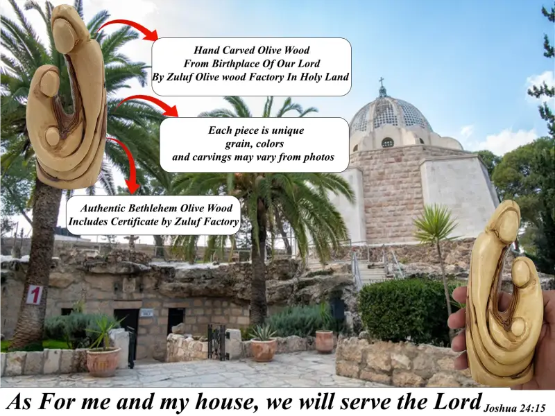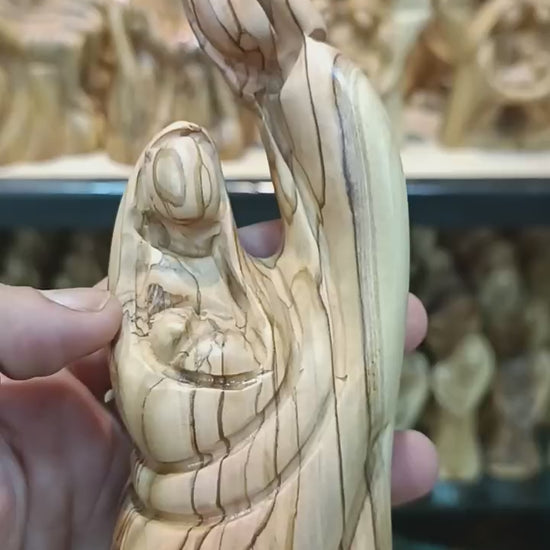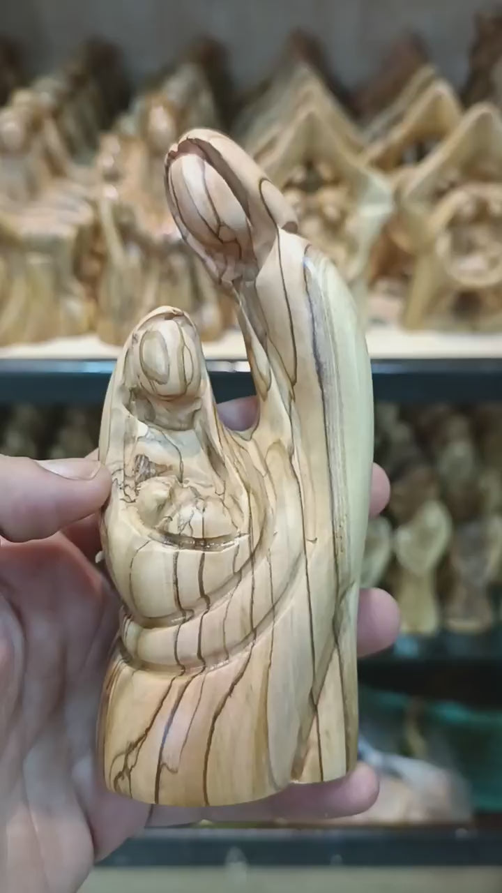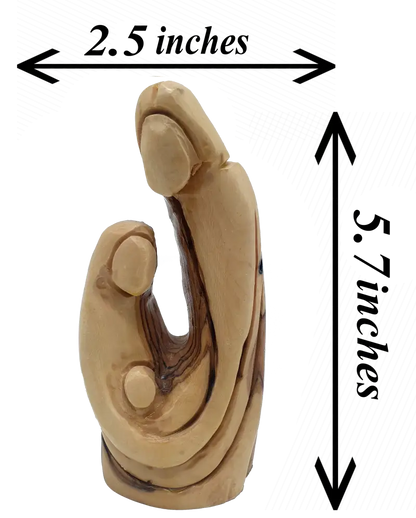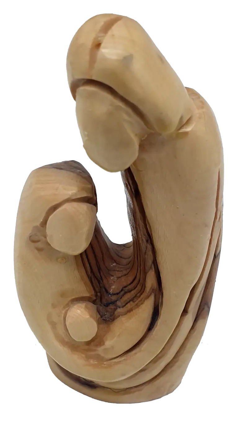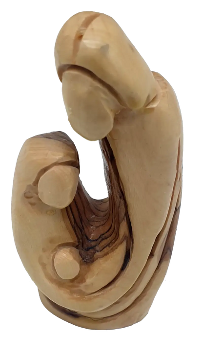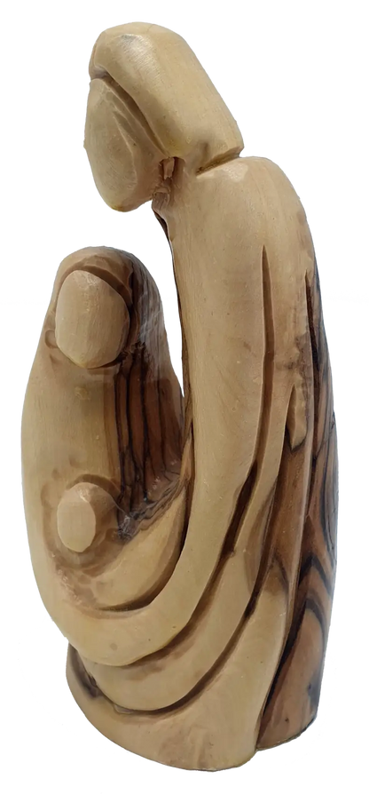 This little Holy Family statue is made by hand from real olive wood, carved right in Bethlehem. It shows Mary, Joseph, and baby Jesus together, just in a quiet and simple way.