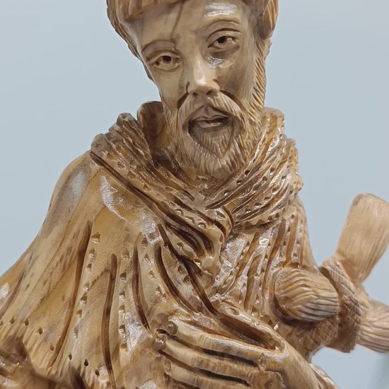 This exquisite Saint Francis of Assisi statue is carefully hand carved from genuine olive wood by skilled Christian artisans in Bethlehem . Every detail reflects traditional Holy Land craftsmanship, making each piece truly unique with natural wood grain and warm golden tones .