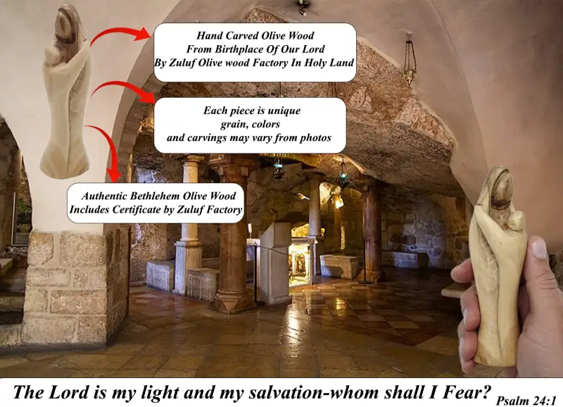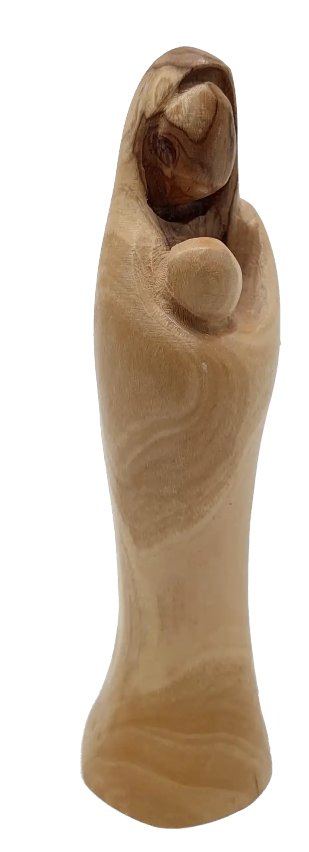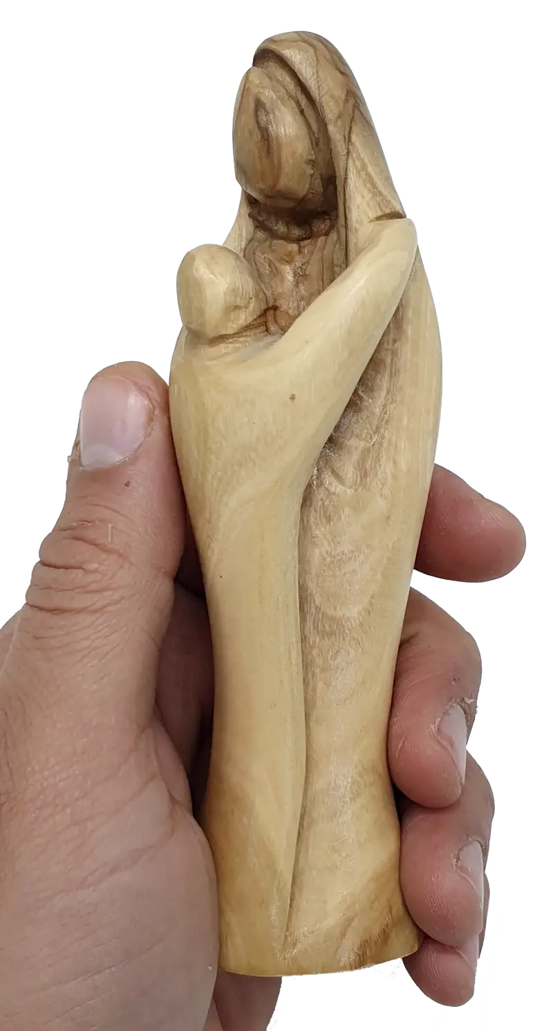 make your spiritual space with the exquisite with Virgin Mary and Baby Jesus hand made olive wood statue, by Zuluf, standing gracefully at 5.3 inches. Handcrafted from real olive wood, this statue honors the holy connection of motherhood with grace and enduring purity.