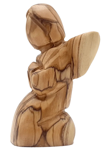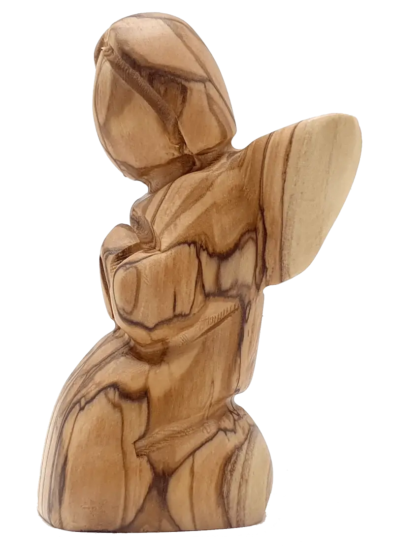 It’s made from olive wood in Bethlehem. The shape is simple, grounded. The arms curved inward. The form leaning. Not perfect — you’ll notice a line here, a nick there — but that's what makes it feel like it’s seen something. Like it remembers.
