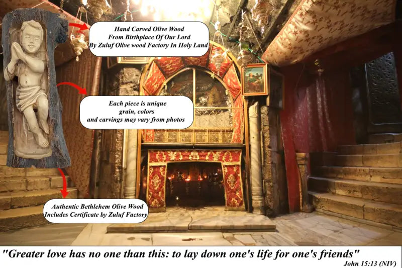 Authentic Olive Wood : Sourced from the Holy Land, the olive wood used in this statue carries a deep spiritual connection and authenticity, bringing a piece of Bethlehem to your space .